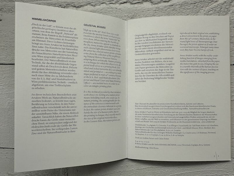 In its capacity as a micromuseum, MuseumQuartier Vienna’s Sternenpassage highlights artists whose work broadly relates to photography. Each resulting series is presented across five illuminated circular display cases mounted on the walls. Lumen Zine is a miniature catalogue supplementing exhibitions at Sternenpassage.