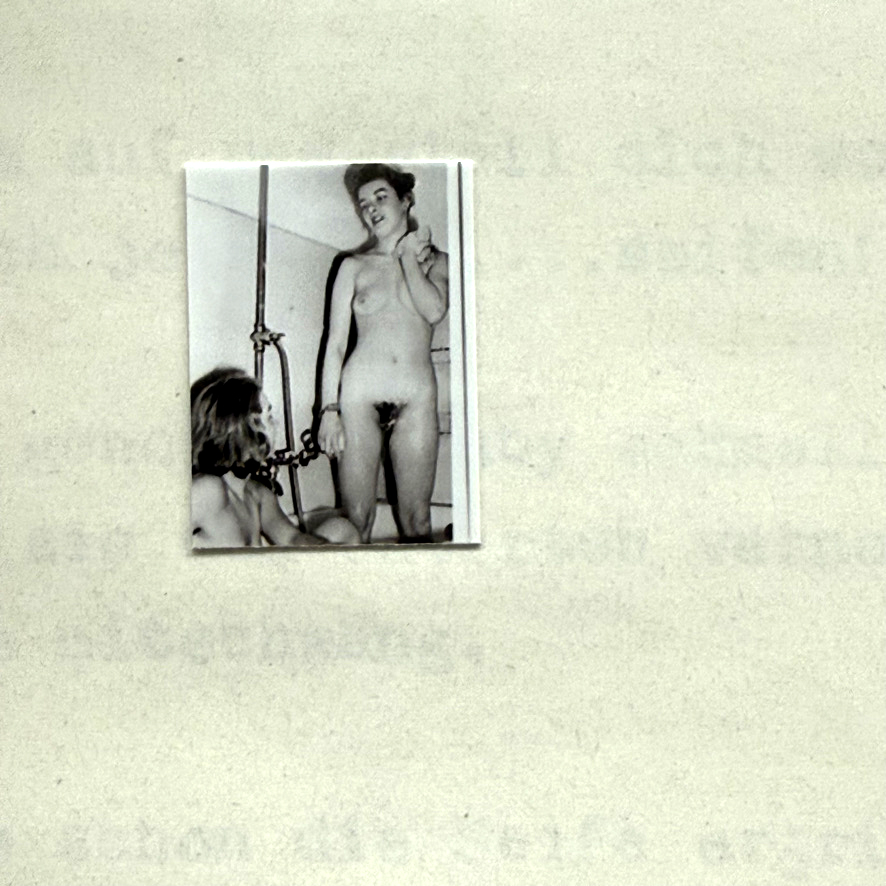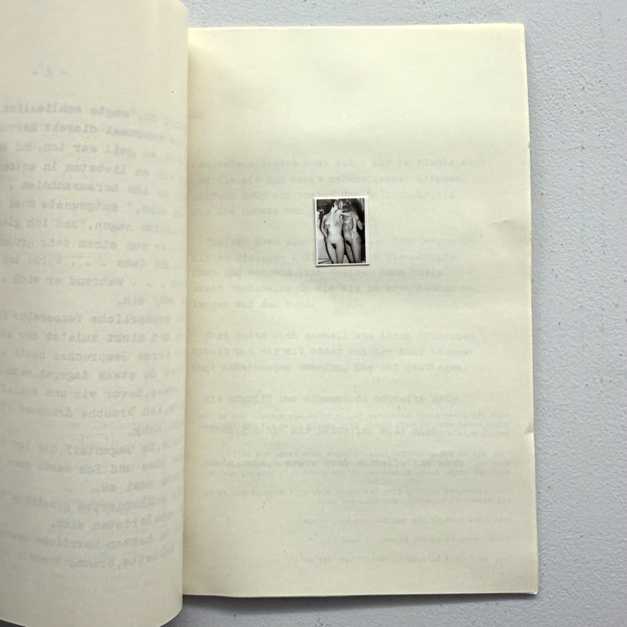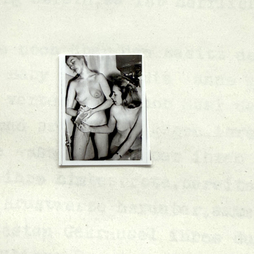 The publication contains original black-and-white photographs produced in a small edition, each individually tipped into the book. The photographs are extremely small in scale (approx. 3 × 1 cm) and depict explicit sexual imagery; their reduced size creates a tension between intimacy, fragmentation, and distance. As original photographic prints, they are an integral component of the publication and simultaneously define it as a multiple art object.