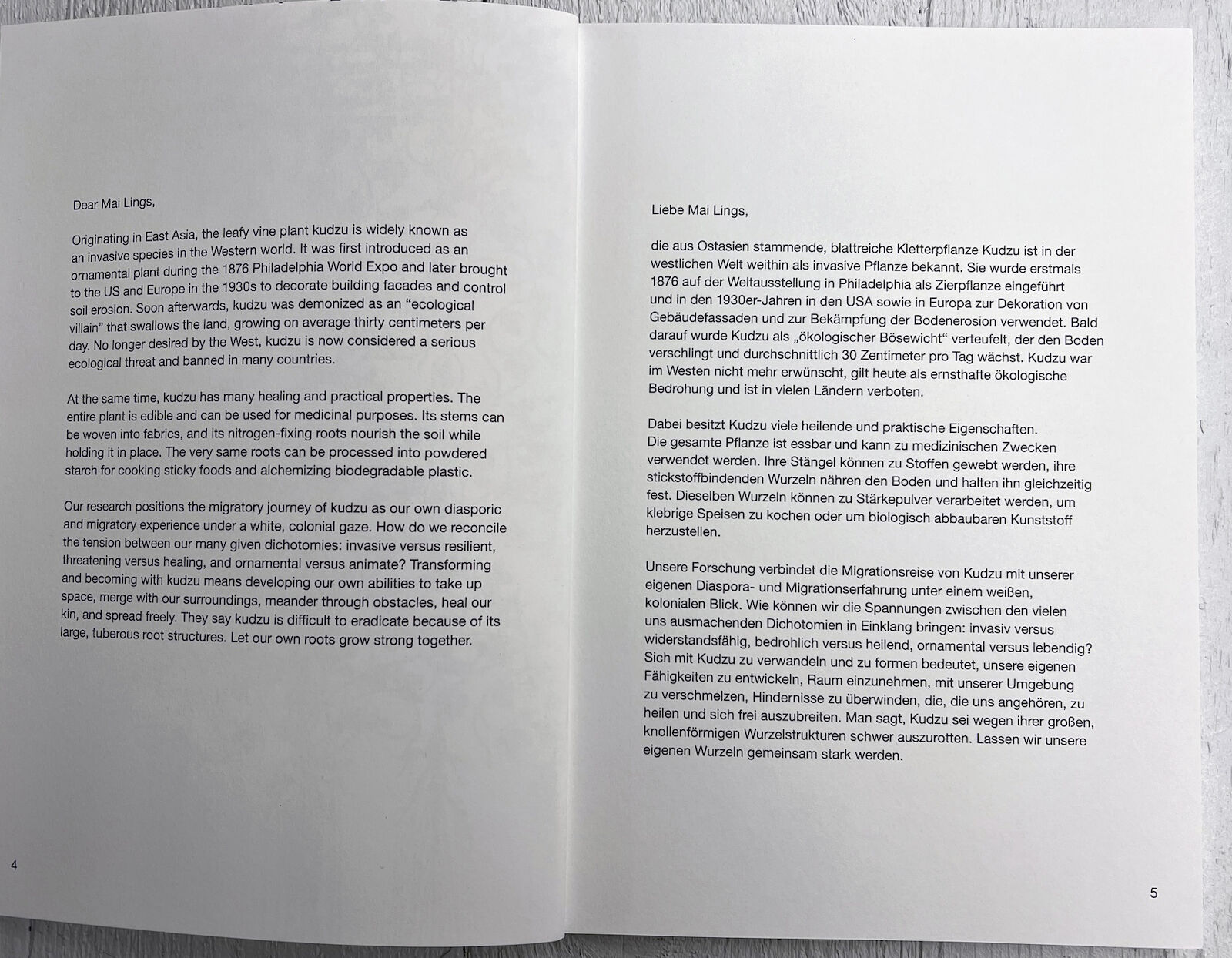 the Asian diaspora association Perilla and the Vienna-based artists’ collective Mai Ling as well as an excerpt from Anne Anlin Cheng’s book Ornamentalism (2019), translated into German by Nicole Suzuki. Artistic intervention: Stick Together, kudzu bioplastic stickers produced in Vienna by Mai Ling and placed on the dust jacket. Each sticker has a different shape and size.
