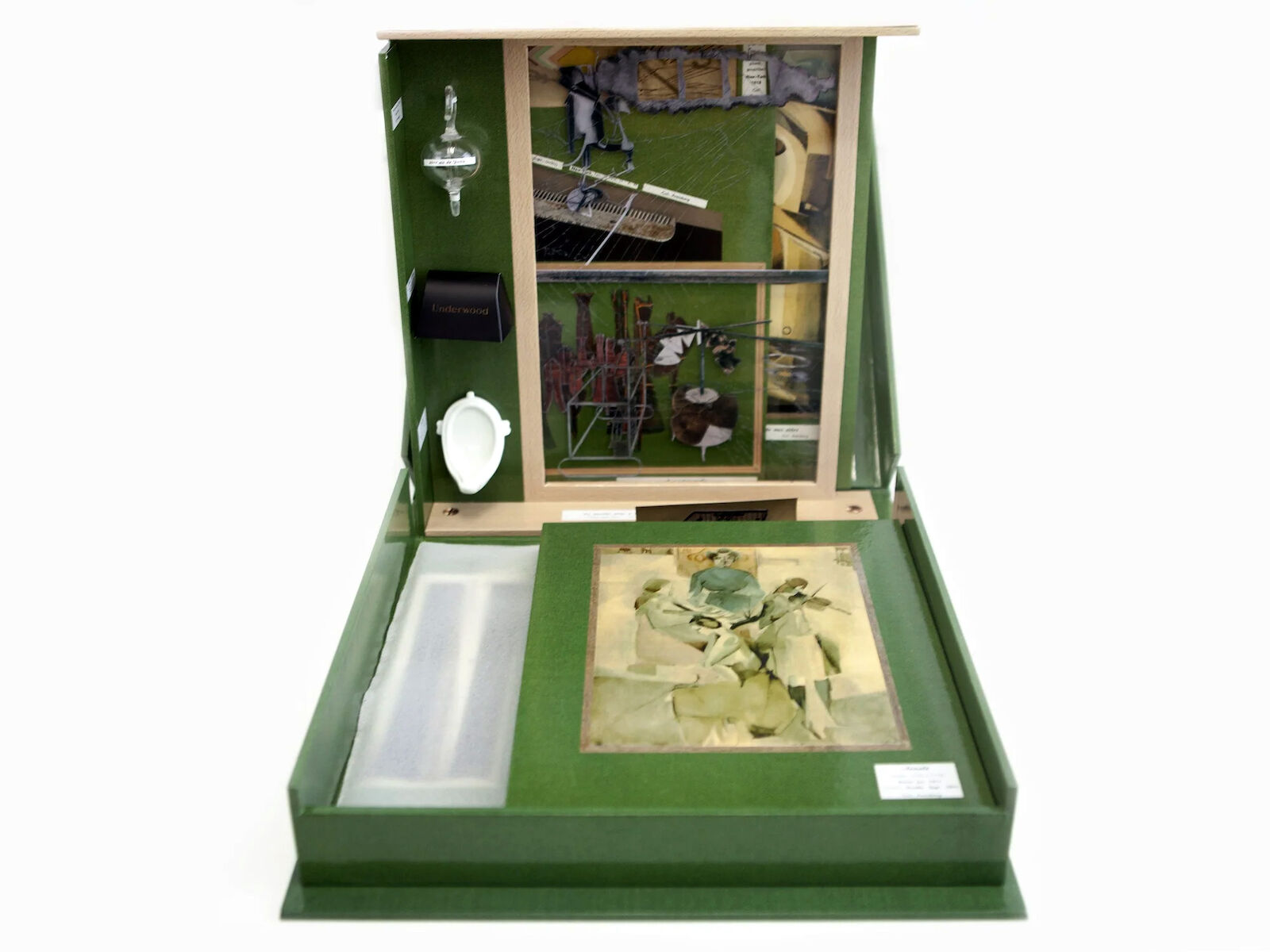 Rare BookMarcel Duchamp (1887–1968), France, active in United States, Box in a Valise from or by Marcel Duchamp or Rrose Sélavy (Boîte-en-valise de ou par Marcel Duchamp ou Rrose Sélavy), conceived 1935–41, edition E assembled in Paris in 1963, green linen imitation leather covered box containing mixedmedia assemblage/collage of miniature replicas, photographs, and