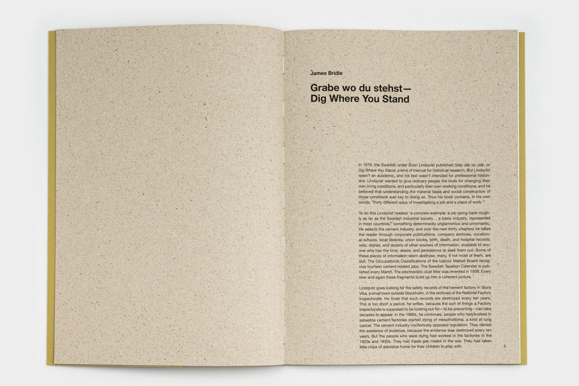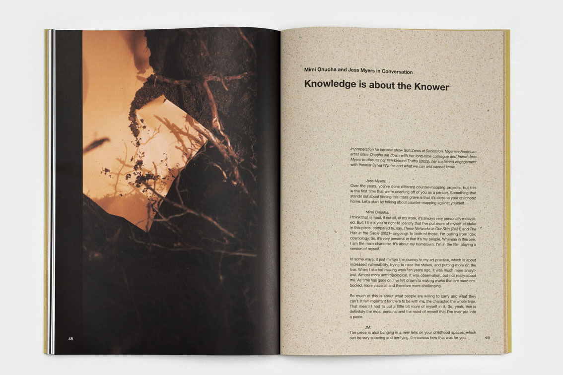 historical denial, and collective forgetting – become meaningful. She points to what has not been collected, asked, allowed, or represented. The exhibition is accompanied by a publication featuring an essay by the artist James Bridle, a conversation between Mimi Ọnụọha and the writer and theorist Jess Myers, and the film script for Ground Truths. The artistic intervention consists in brown fingerprints applied to the cover, evoking the image of hands that are dirty from burying and unearthing stories.