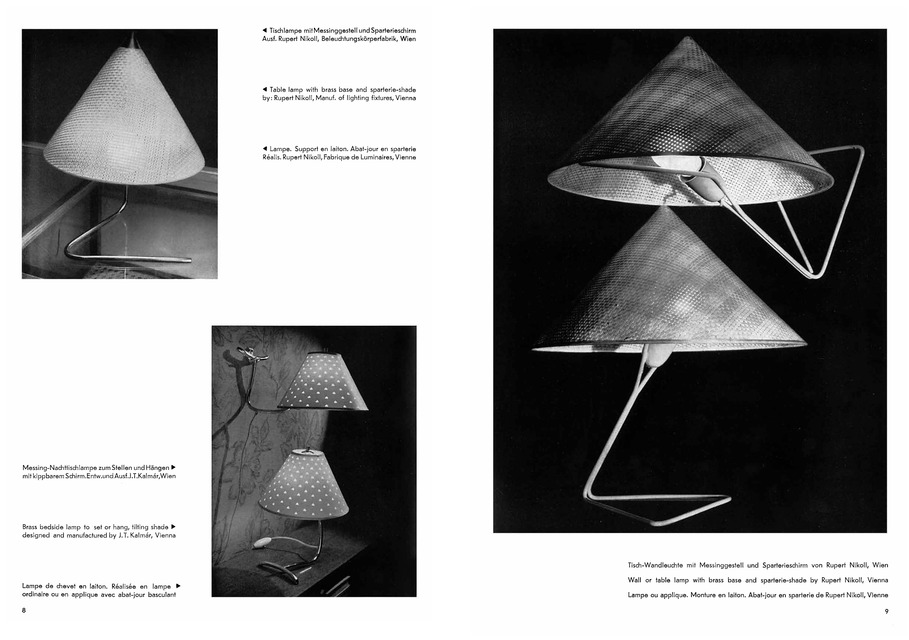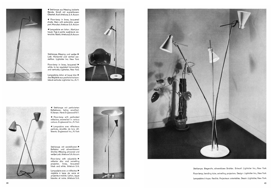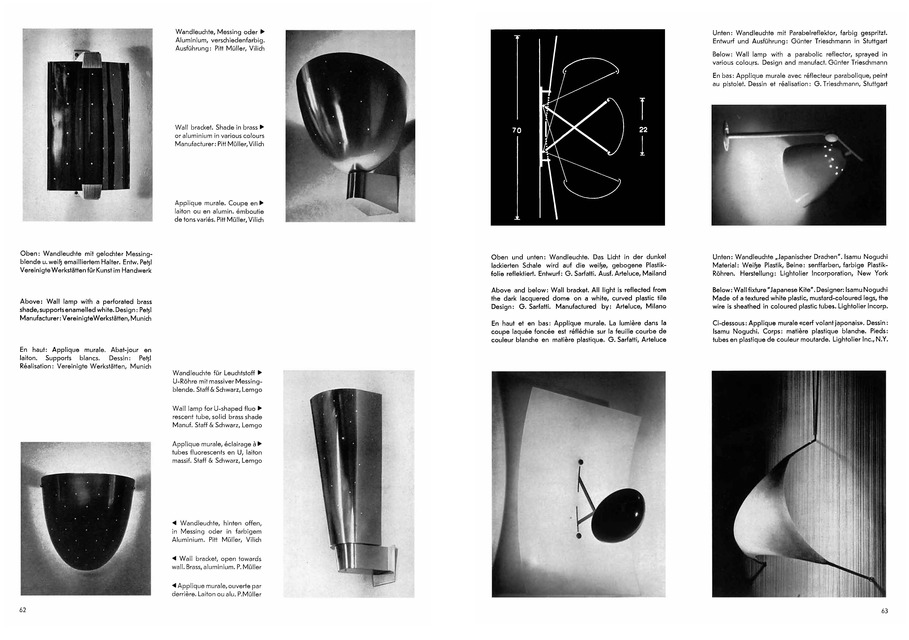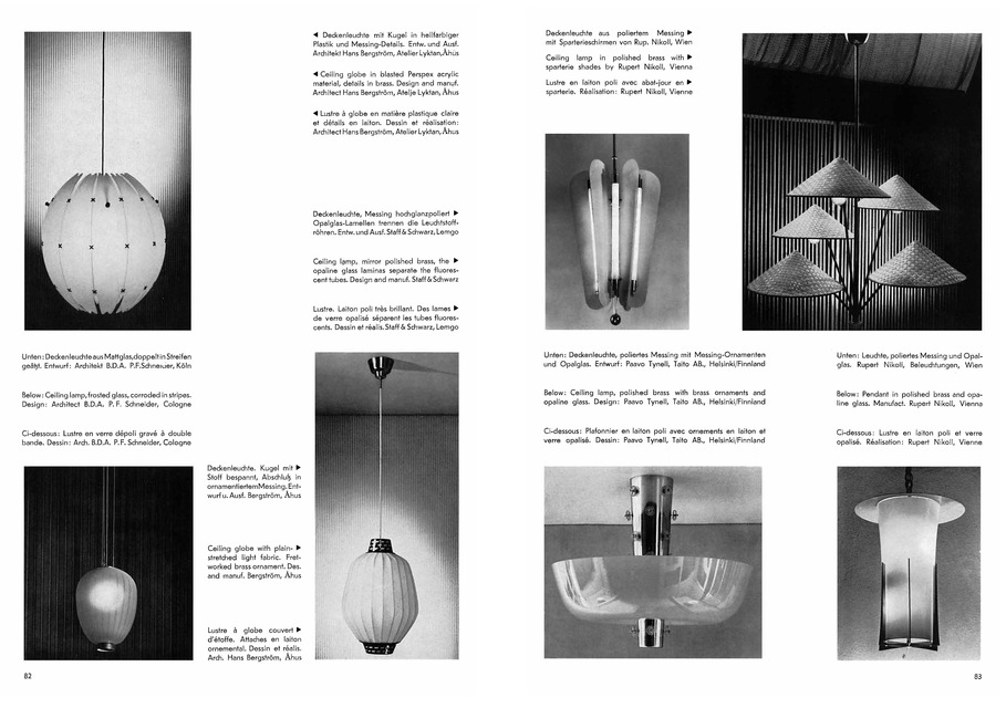 The publication documents a wide spectrum of mid-century lighting, demonstrating how design evolved beyond the geometric reduction of the prewar avant-garde toward more expressive, nationally inflected approaches. After the Second World War, influences from the United States, Scandinavia and Italy increasingly complemented—and at times challenged—the Bauhaus-derived functionalism that had previously dominated German design discourse.
