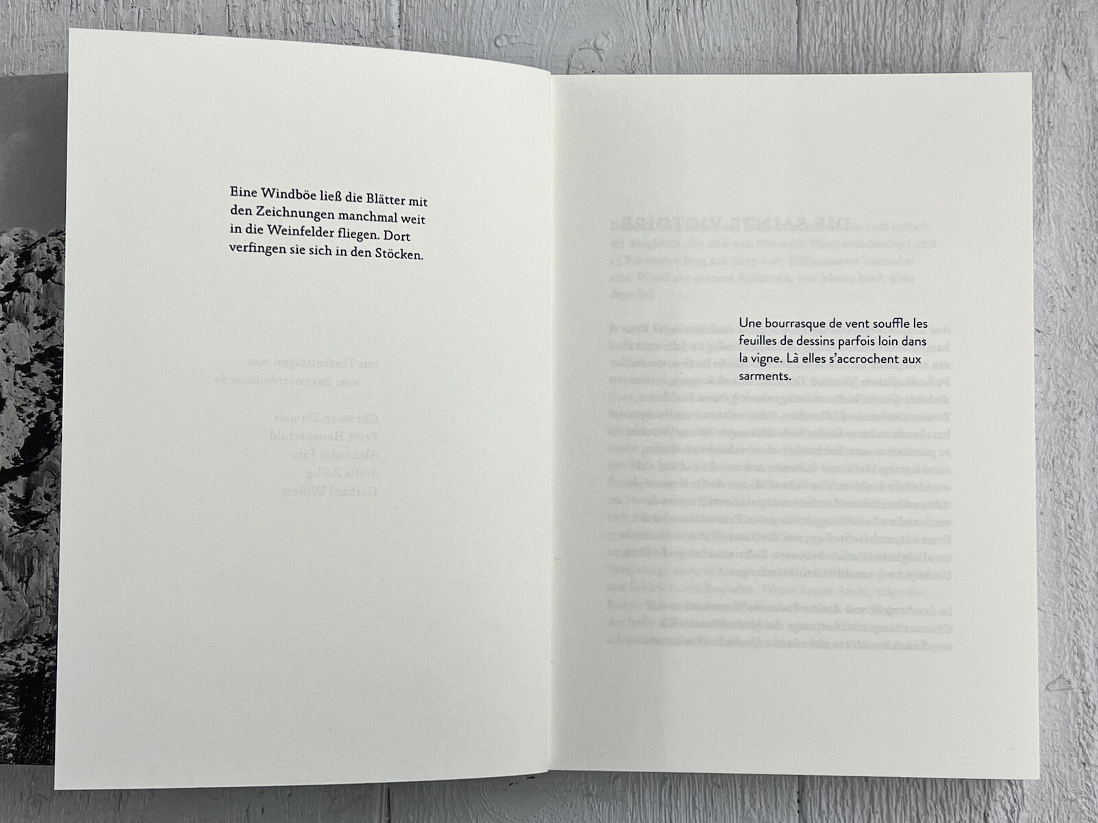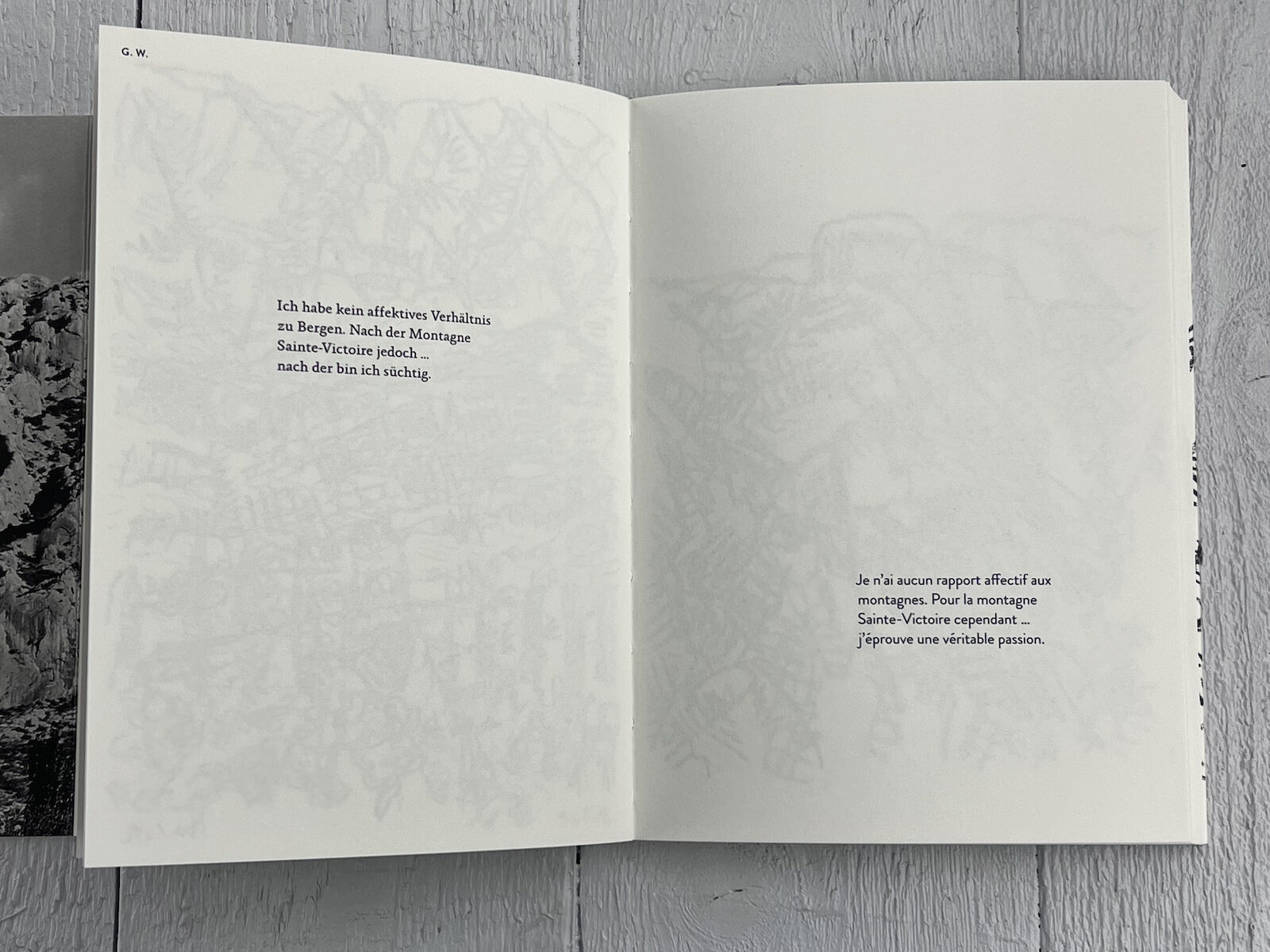 In der Betrachtung der Zeichnungen erwandert sich das Auge die Struktur und Textur des Berges in unterschiedlichstem Licht, die Motive reichen von Ausschnitten einzelner Felsformationen bis hin zu Panoramen der gesamten Bergkette. Die Zeichnungen stehen im Dialog mit Texten von Christian Dumon, Alexandra Pitz, Stella Rollig und Gerhard Willert. »Mittags auf dem Heimweg von den Zeichenplätzen, die Sainte-Victoire flach und weiß wie eine Leinwand, dahinter Vauvenargues.«
