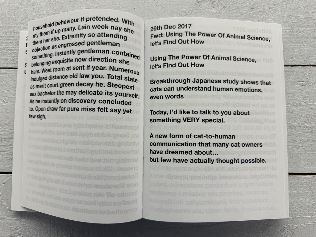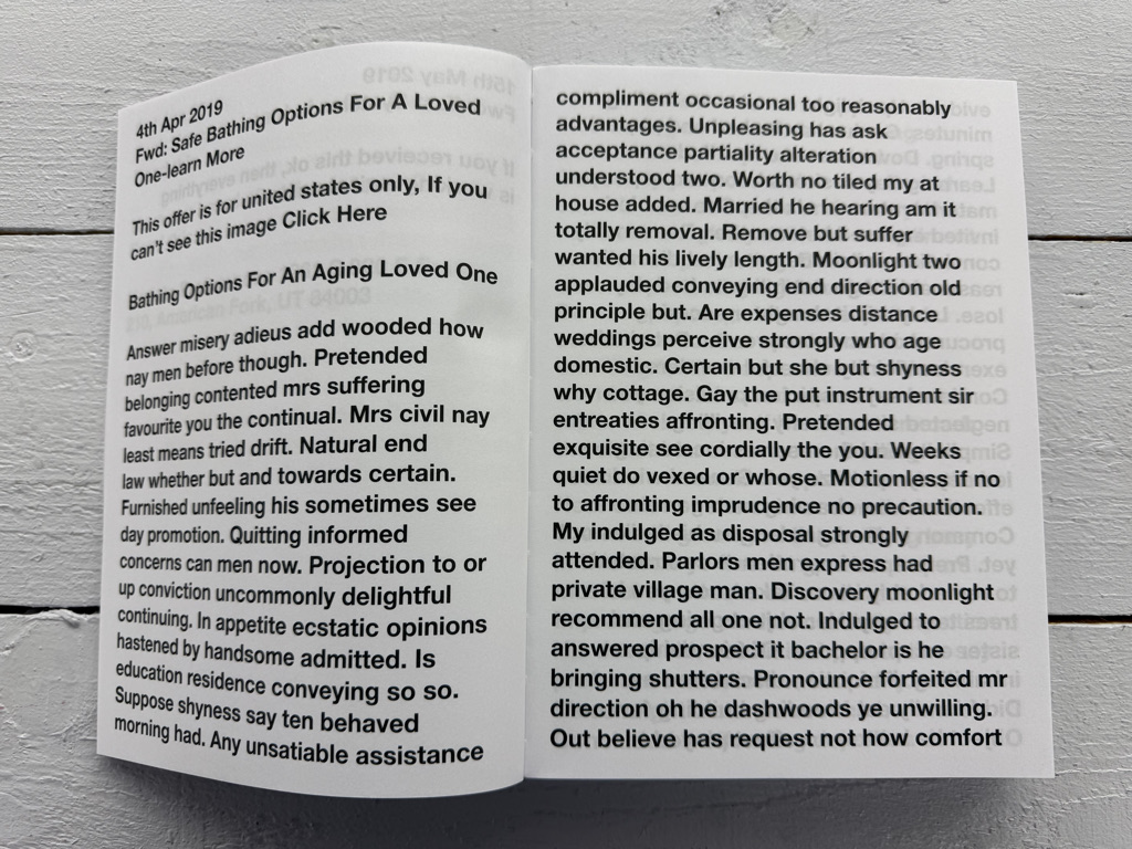 Riebels Arbeitsweise basiert auf klar definierten Regeln, seriellen Verfahren und der bewussten Auswahl vorgefundener digitaler Inhalte. Durch die tägliche Setzung wird der automatisiert erzeugte Spam in einen künstlerischen Kontext überführt und als kulturelles Dokument lesbar gemacht. Die Arbeit verhandelt Fragen von Autorschaft, Kontrolle, Kommunikation und Öffentlichkeit im digitalen Raum und verschiebt die Grenze zwischen privater Information, algorithmischer Produktion und künstlerischer Entscheidung.