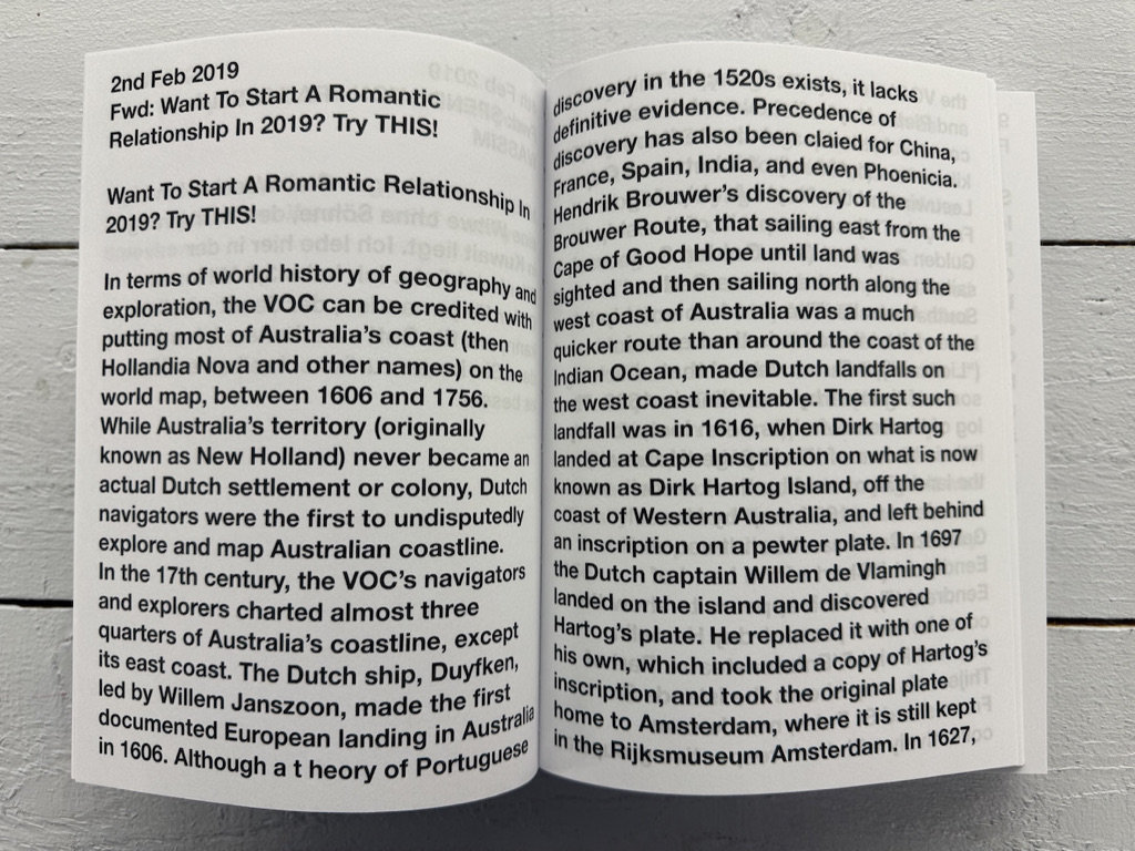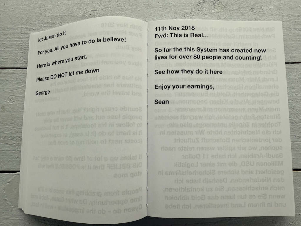 an verschiedene Social-Media-Plattformen weiter. Die kontinuierlich anwachsende Sammlung bildet ein offenes Textarchiv, das als Rohmaterial für weitere künstlerische Aktionen und Projekte dient.