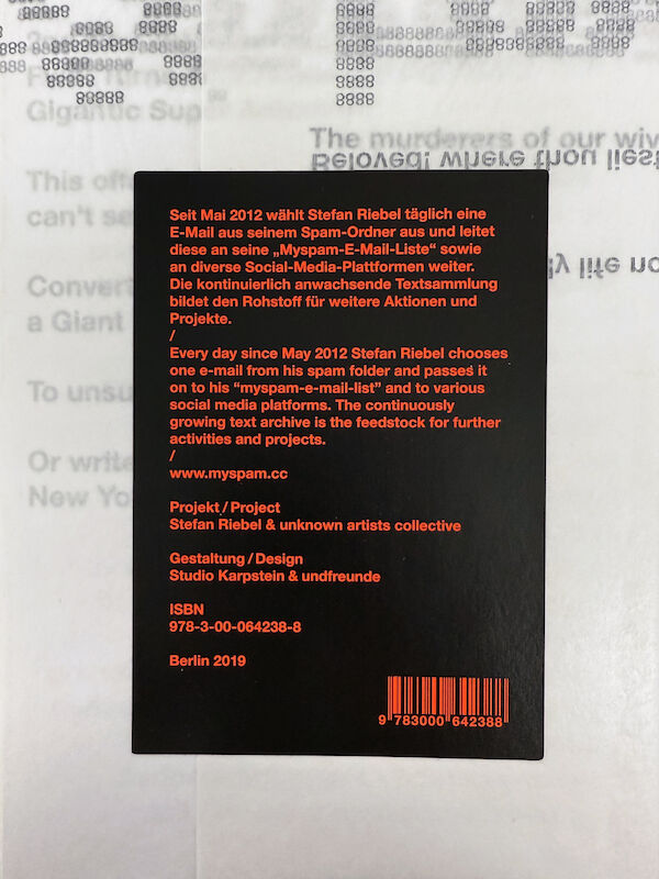 Seit Mai 2012 wählt der Künstler Stefan Riebel täglich eine E-Mail aus seinem Spam-Ordner aus und leitet sie an seine „Myspam-E-Mail-Liste“ sowie