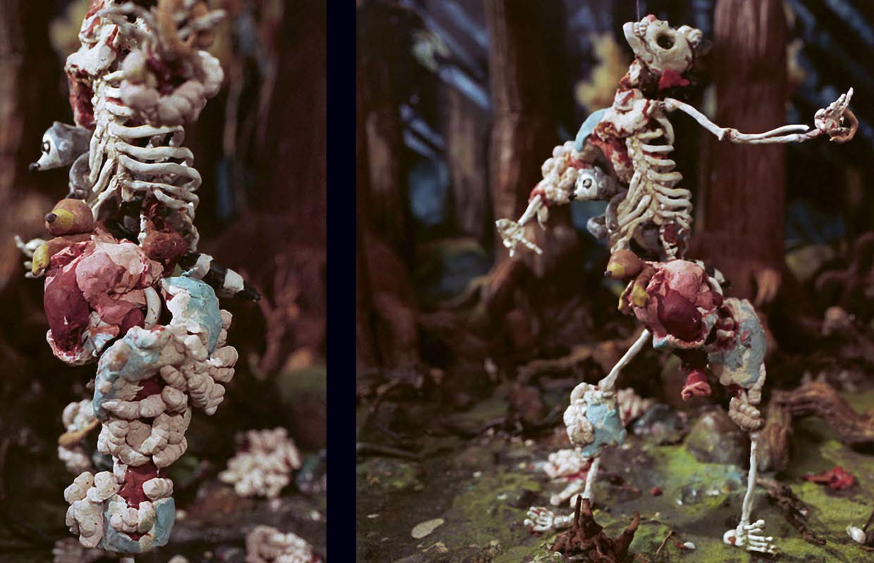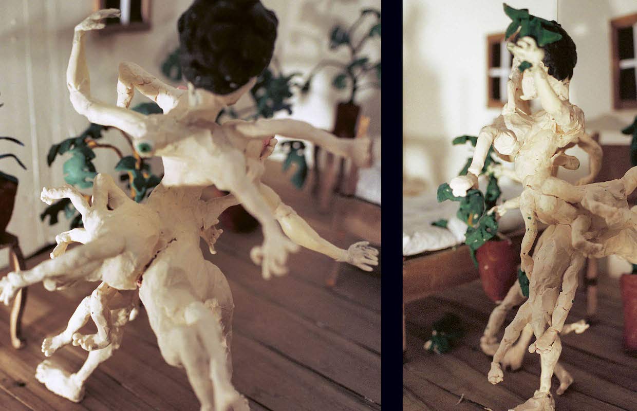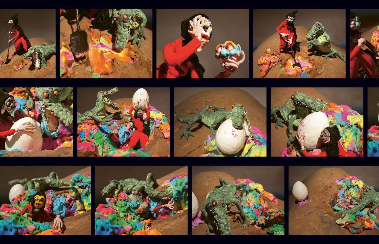 Their playfully narrated fables contain both humour and darkness and defy the laws of gravity. Djurberg's lively stop-motion films and plasticine figures are accompanied by Berg's electronic music, resulting in surrealistic-looking scenic installations. These chamber plays resurrect suppressed fragments of memory between innocence and shame, or feverish daydreams between role-play and lust. The shadowy landscapes, closed rooms and brightly lit scenes of their films are inhabited by groups of obsessed individuals who seem to devour each other.