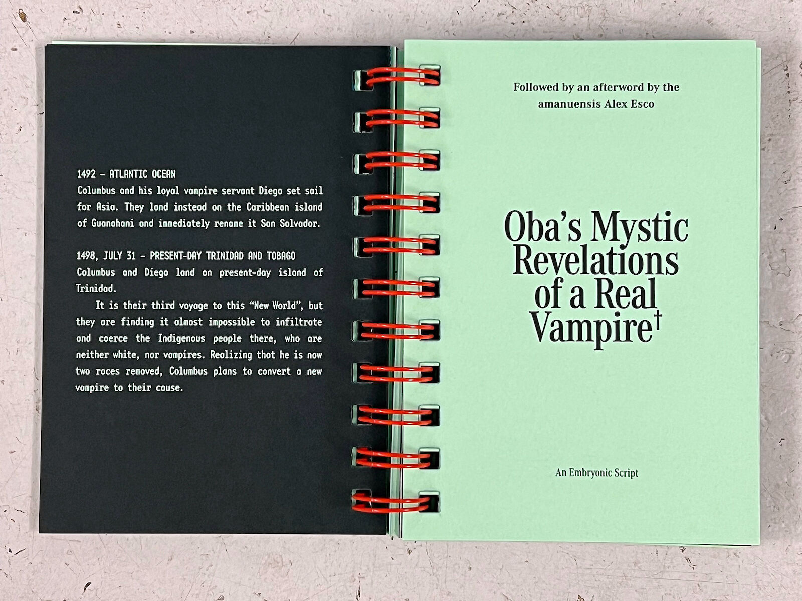 Interspersed with excerpts from Oba’s literacy diaries, Nosferasta: The Book features critical essays, speculative fiction and visual contributions by Peggy Ahwesh, Lou Cornum, Alex Esco, Sabel Gavaldon, Adam Khalil, Mutabaruka, Oba, Austin Sley Julian, Bayley Sweitzer, and Laura Vallés. Designed by fag tips (aka Virgil b/g Taylor).