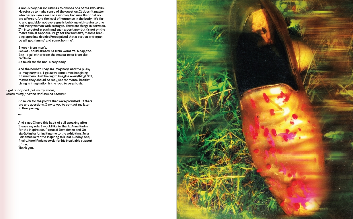 Questioning the ephemeral quality of a performance, the artist published a documentation of an act he did in 2017. The textual score of the performance and the visual material became an independent art book. Suspended between a theoretical lecture and a personal diary style, the publication captures a subjective experience of non binary person who practices sex with gay men. The project poses questions on the place of body in our language, appropriation of sexuality by marketing and consumerism and problems in defining non-binary identity. Photographs and texts: Julek Malinowski, Book Design: Wikor Gromadzki