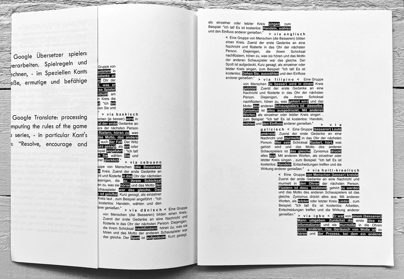Kants Losung „Entschließe Dich…“ (zur Aufklärung deines Nullpunkts) über google-Afrikaans bis google-Zulu ins google-Deutsche (bzw. google-English) ableiten. - Was bewegt sich im Feld zwischen den verschiedenen Textsträngen / Weltbezügen / Redewendungen: „homo ludens“ und „homo sapiens“? - Was spricht?
