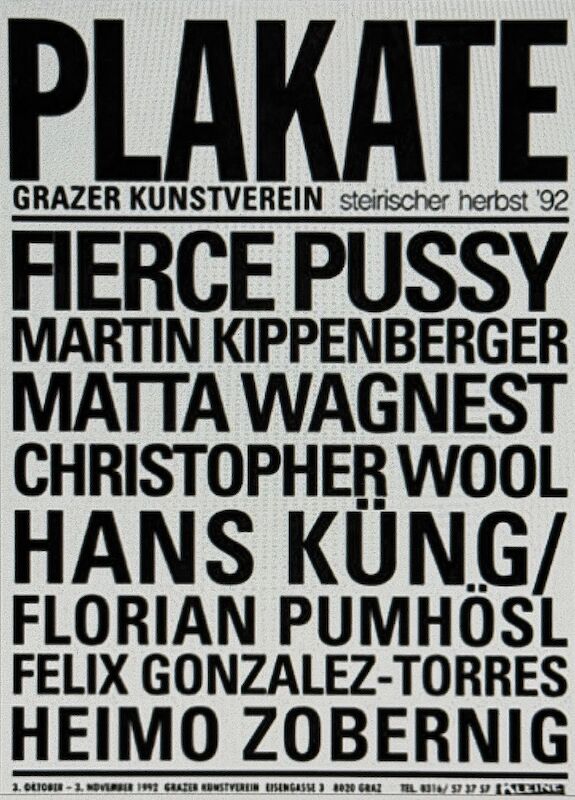 The artists Felix Gonzales-Torres, Martin Kippenberger, Matta Wagnest, Chrisopher Wool, Heimo Zobernig, Hans Krüg and Florian Pumhösl, as well as the group Fierce Pussy, were given billboards all over Graz for which they were to design their own special statement on the theme.
