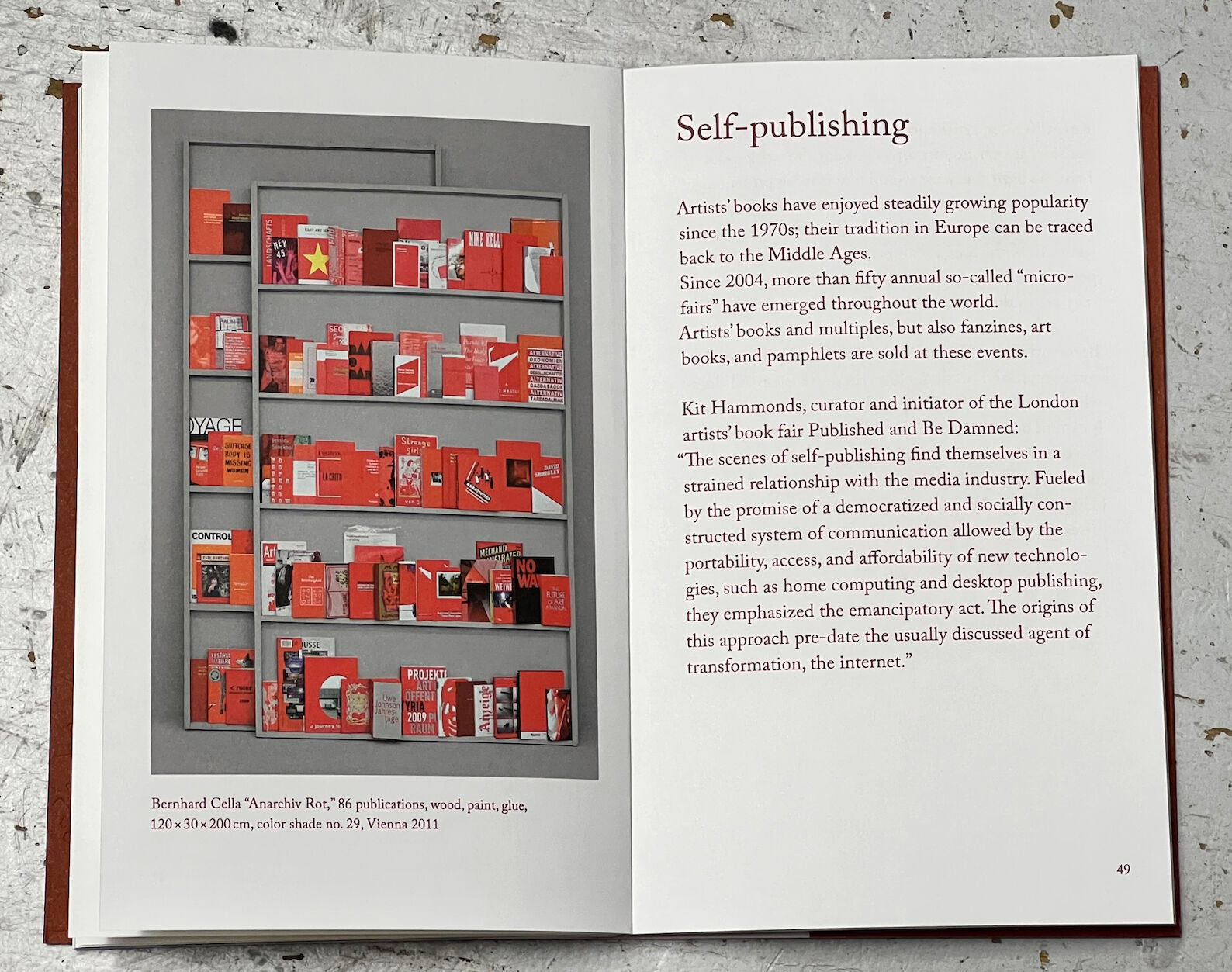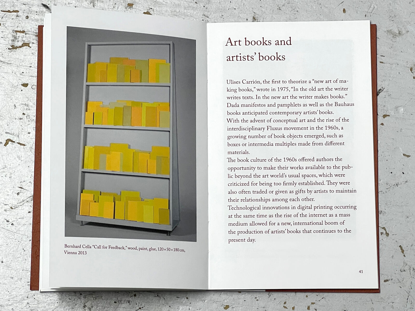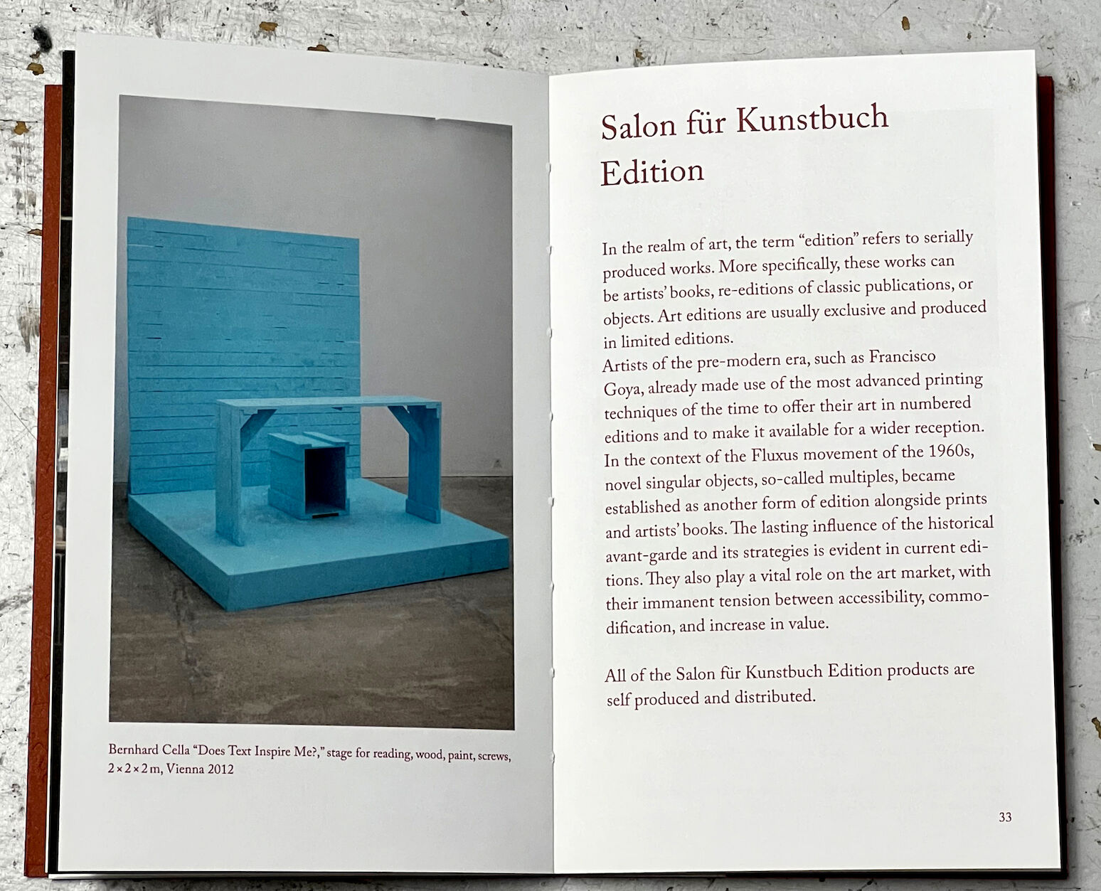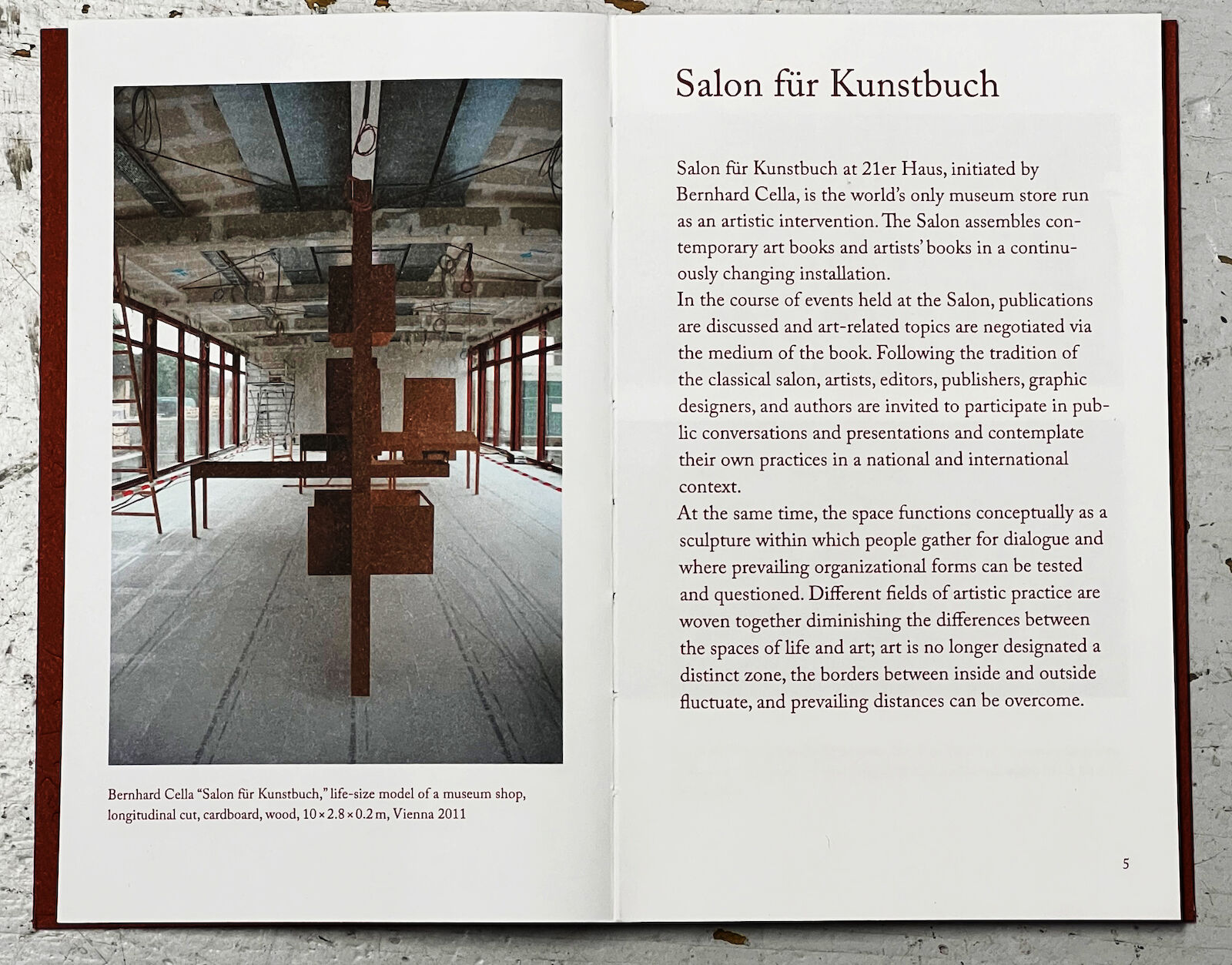 This catalogue is published to accompany the process-based installation "Salon für Kunstbuch" by Bernhard Cella on the occasion of the fifth anniversary of the 21er Haus.