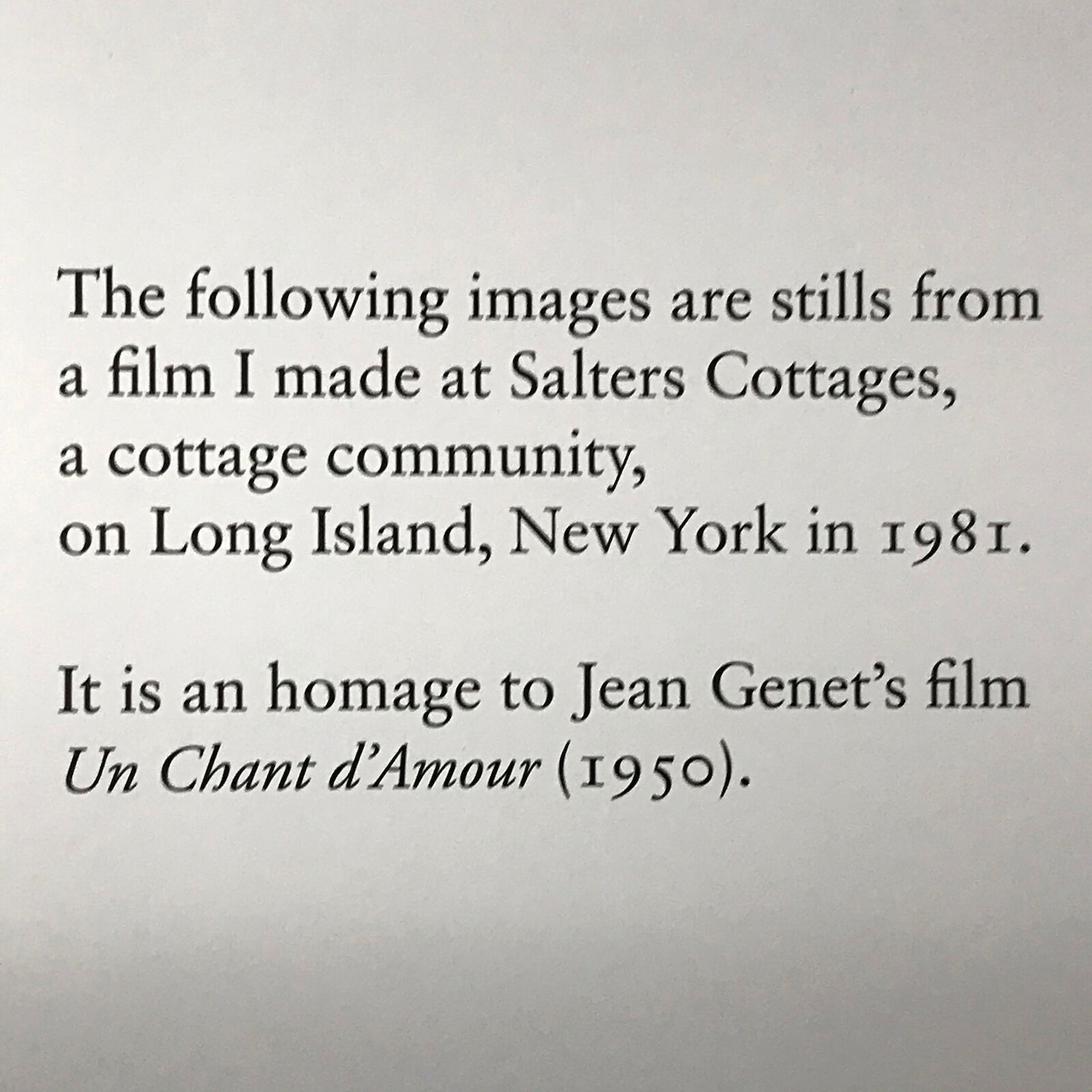 It is a fifteen and a half minute 16mm film, whose soundtrack is a Bell and Howell projector. An homage to Jean Genet's Un Chant d'Amour (1950), Salters Cottages features Peter Hujar, John Erdman, Suzanne Joelson and Gary Stephan as the voyeurs and the observed.