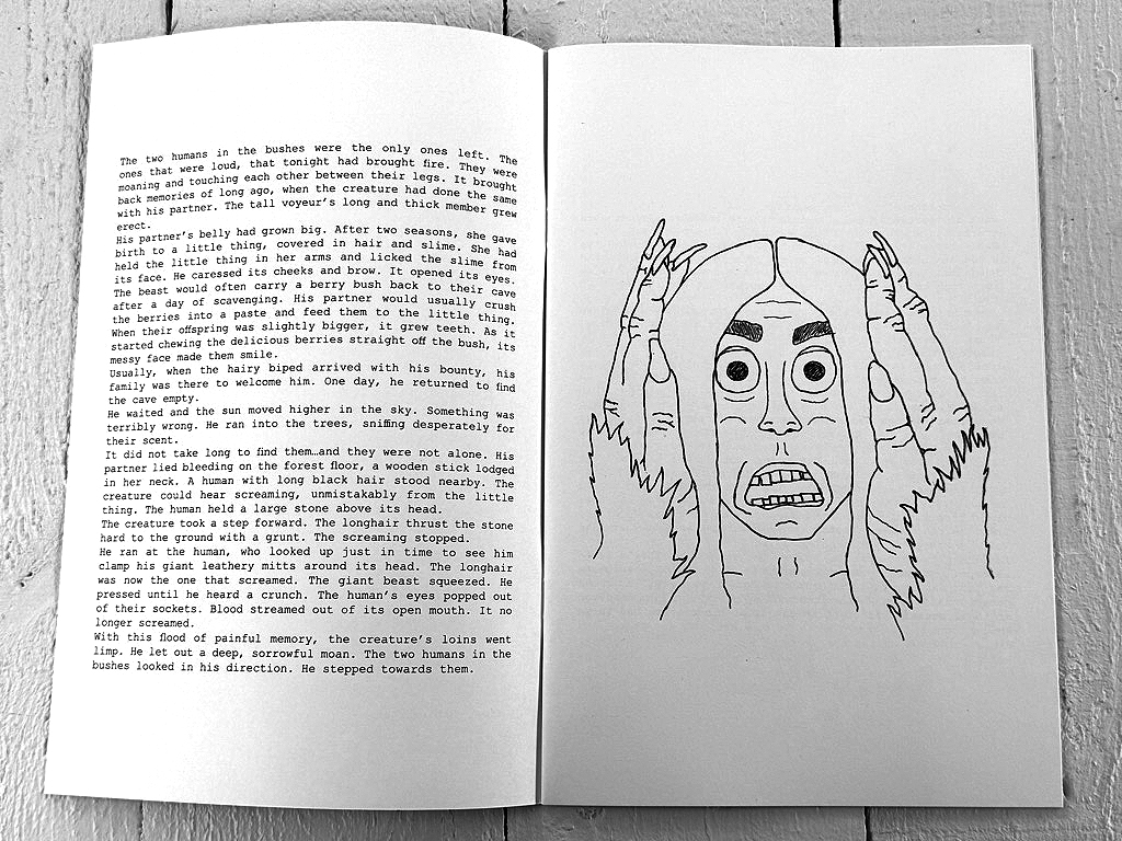 The idea for Kill, Bigfoot, Kill! is contained in Evans' concept-drawing series "Direct-To-Video" (2022–), which has been expanded with new drawings and will be exhibited at the gallery in the Schleifmühlgasse along with the original drawings from the comic. "Kill, Bigfoot, Kill!" is about ideas, and sometimes realizing them, whether through film (Murderkino, The Demoniacs), novella (Wheels of Rage), or comic book.