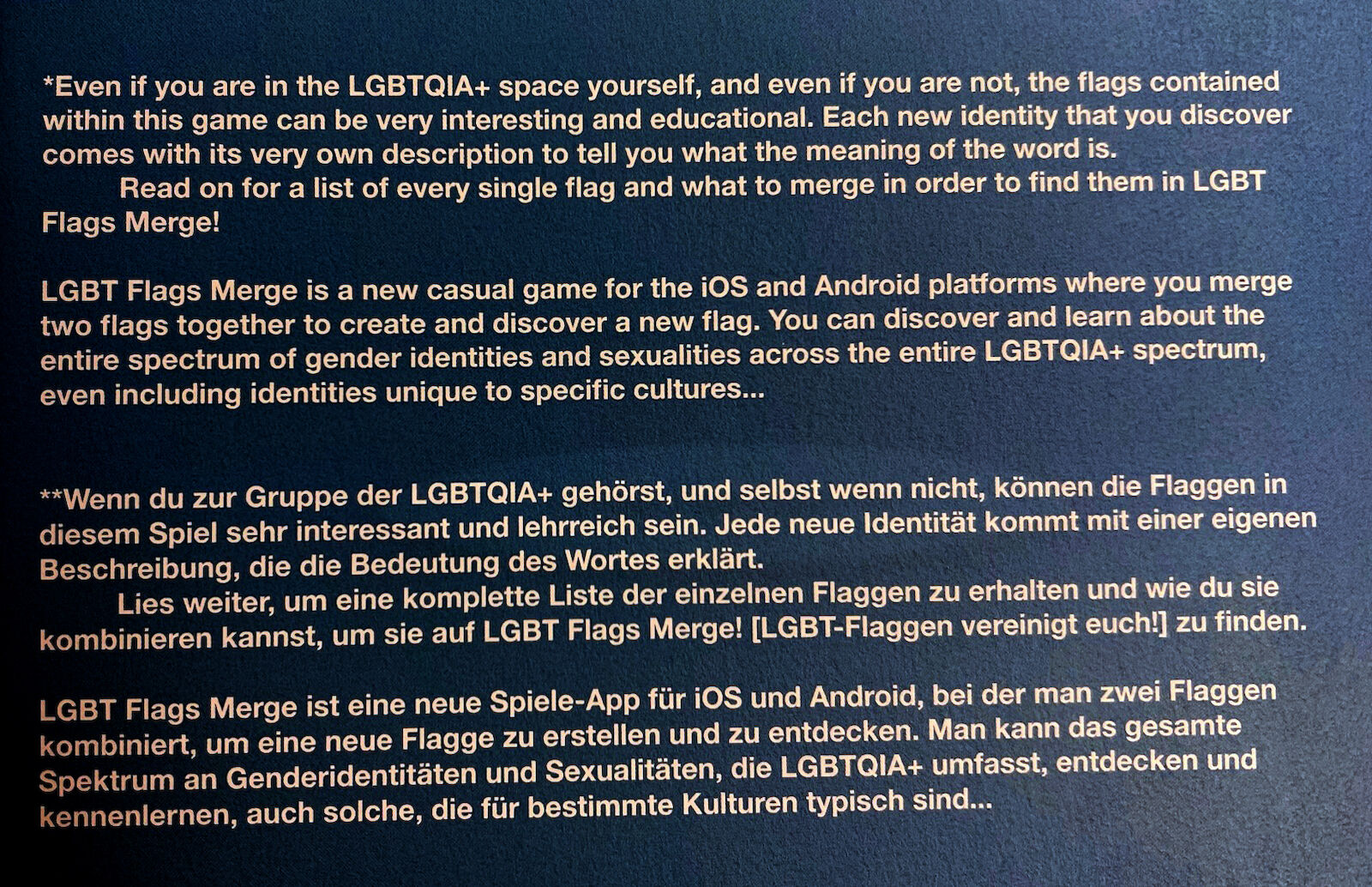A comprehensive publication of street-style photographs taken by SoiL Thornton with their cell phone since 2015 combined with the codes for gender identities and sexualities of the LGBT Flags Merge! game app and a text commissioned by the artist (author: Andrew Blackley) will accompany the exhibition Choosing Suitor.
