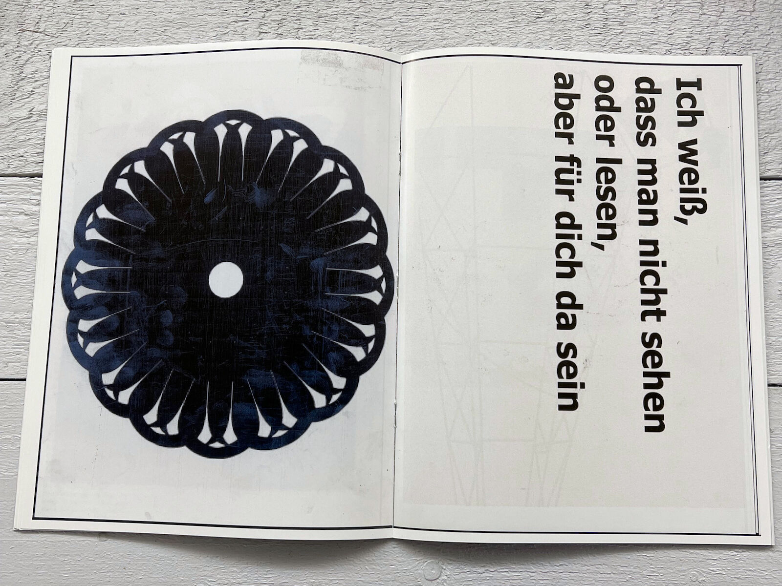 Mustern organischer Strukturen und abstrahierten Porträtfotos aneinander. Die Porträts könnten ebenso eine Erscheinung im Schatten oder Wegweiser aus dem Unterbewussten sein. Mit Schrift gestaltete Paneele senden knappe Codes, deren Schlüssel jeder bei sich suchen muss. Der Künstler bespielt Wandflächen inmitten von funktionaler Information und rationaler Kommunikation und schickt somit die Passanten auf eine kontemplative Reise.
