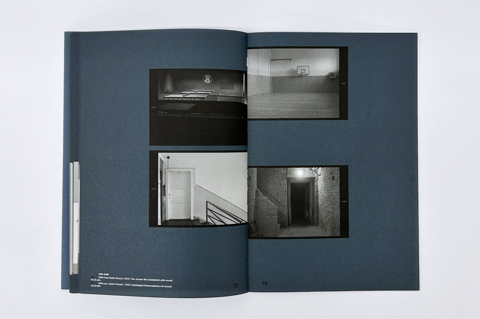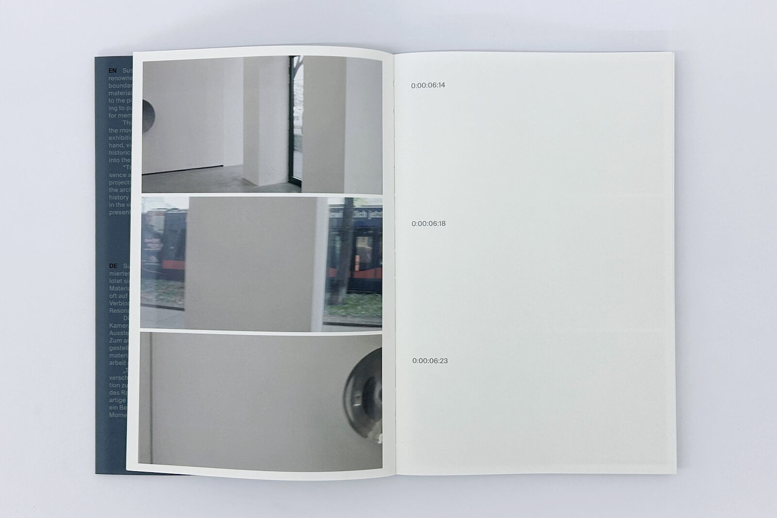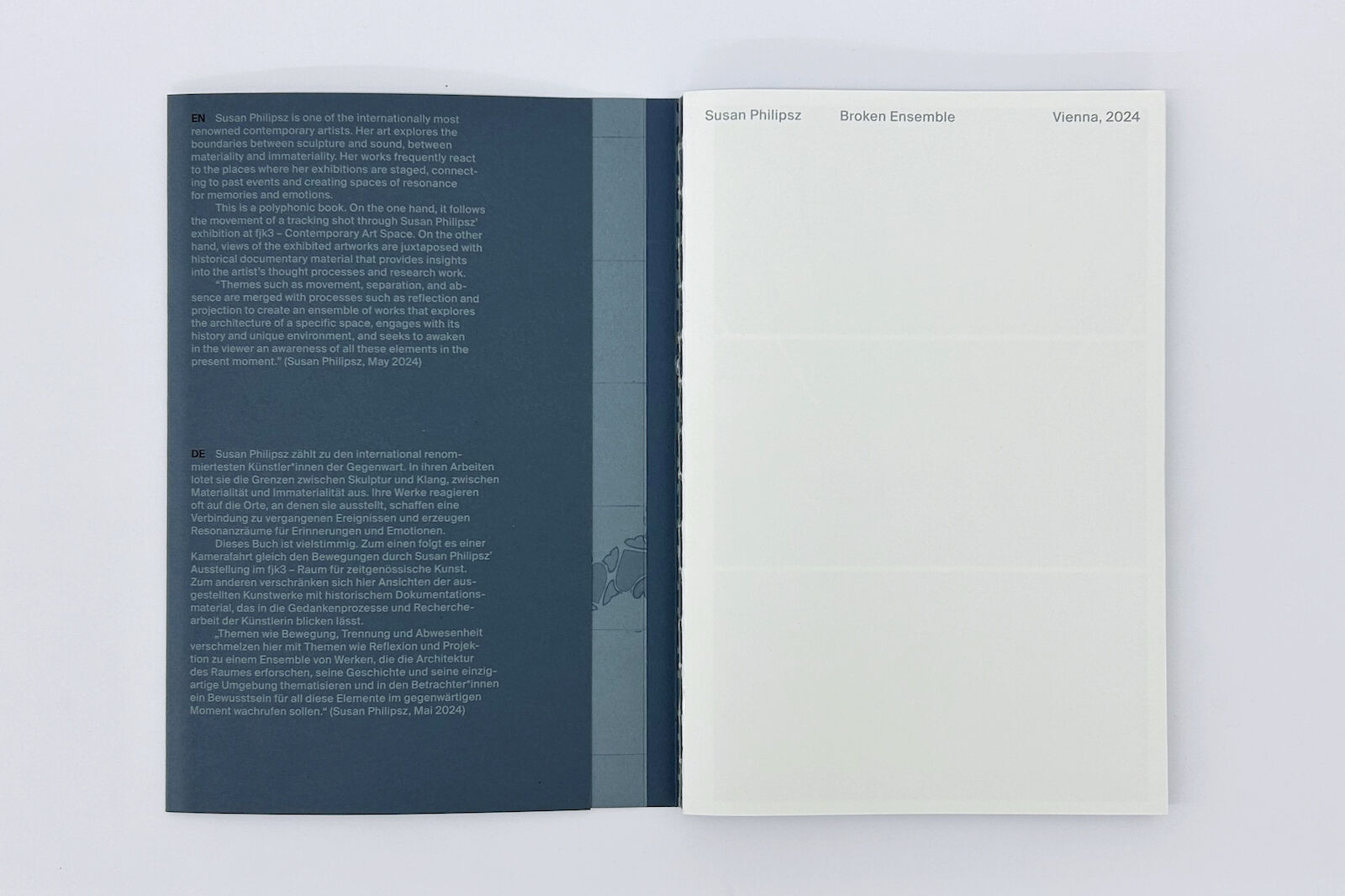 Her works frequently react to the places where her exhibitions are staged, connecting to past events and creating spaces of resonance for memories and emotions. This is a polyphonic book. On the one hand, it follows the movement of a tracking shot through Susan Philips' exhibition at fjk3 - Contemporary Art Space. On the other hand, views of the exhibited artworks are juxtaposed with historical documentary material that provides insights into the artist's thought processes and research work.