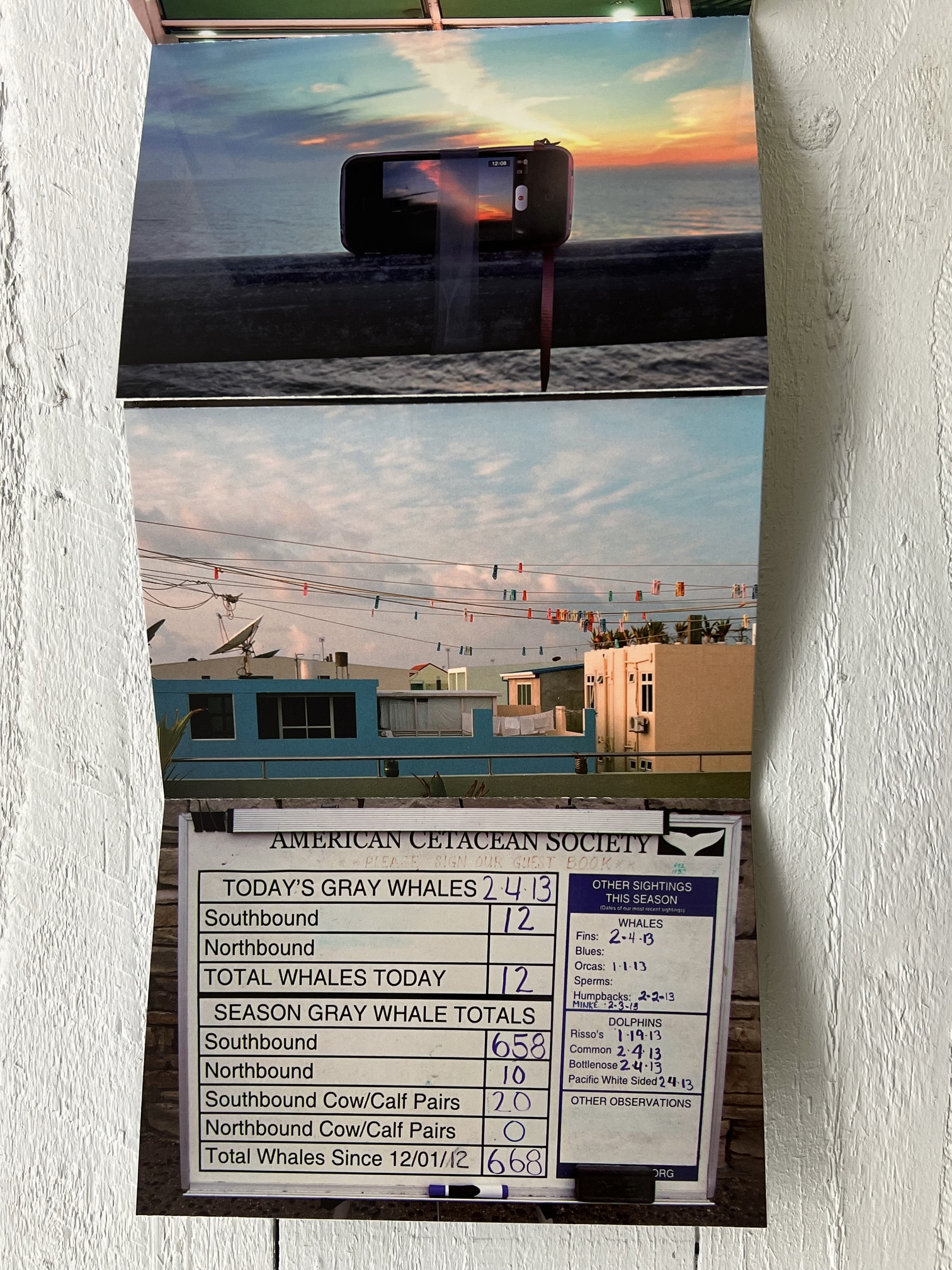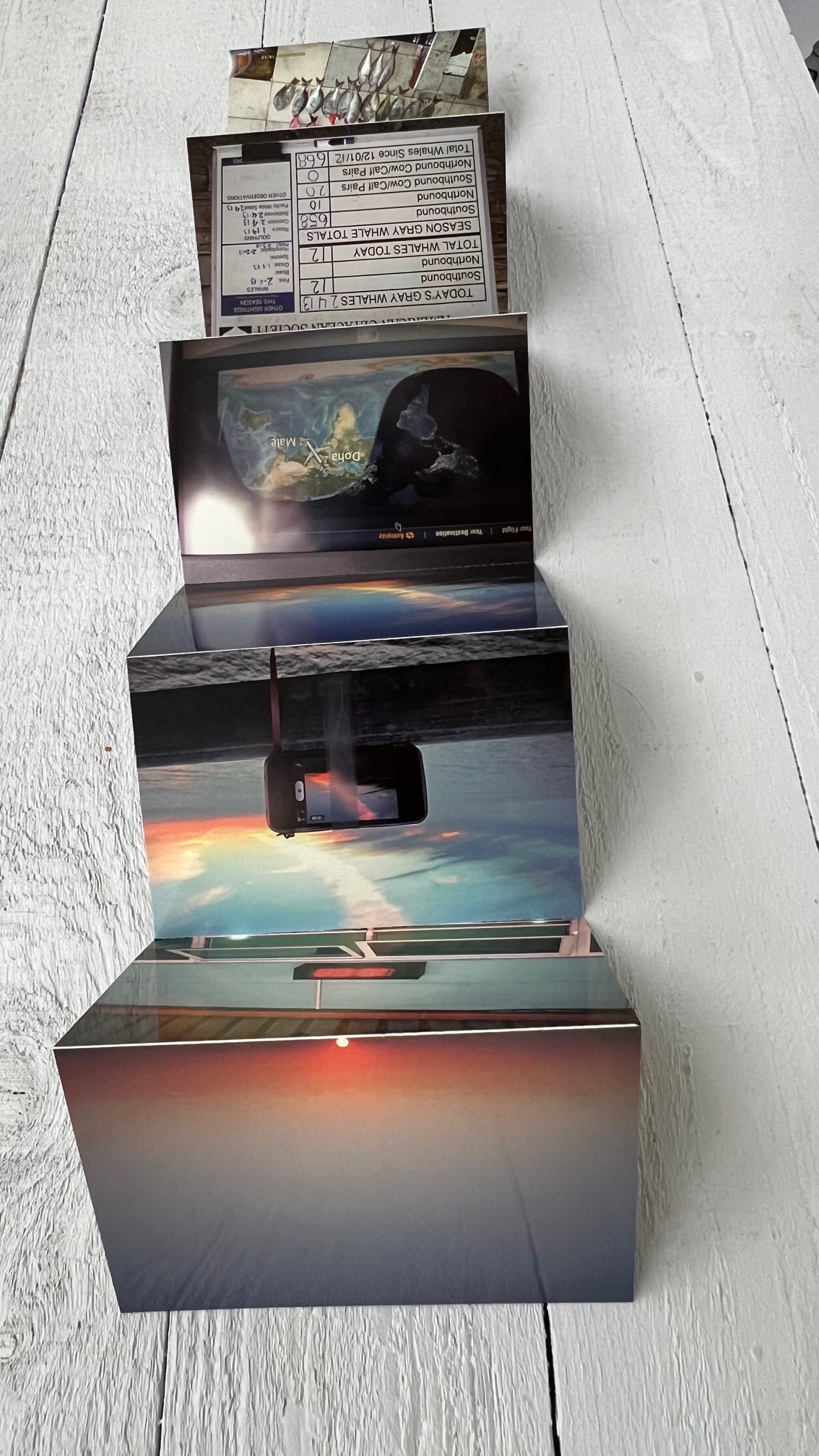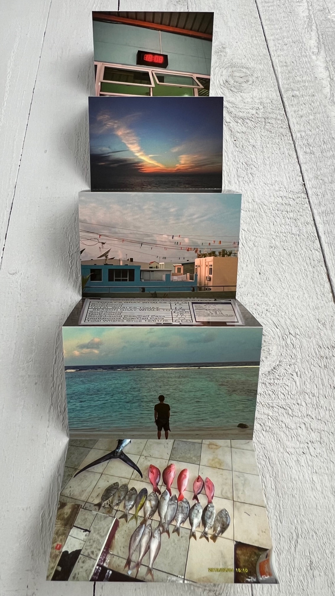 An accordion postcard booklet made to accompany a work of Horvitz's that was in Art Basel, 2013. On the reverse is an interview with Horvitz by David Senior. This publication and the piece is premised upon the artist's discovery that "in early February, the California sunset coincides with the Maldives sunrise...."