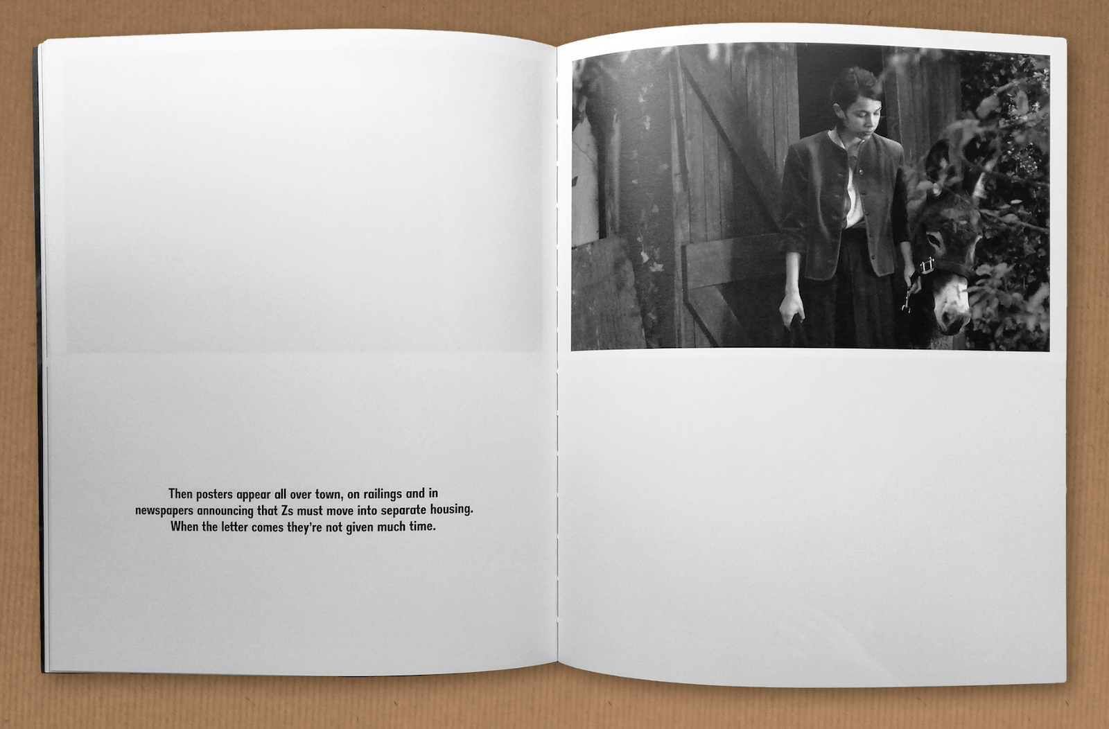 The book features a text, based on sections of a memoir of Budapest in 1944 and scenes which re-enact and reframe Bresson’s allegorical story about the scapegoating of innocent subjects. Partly shot on the streets of present-day Budapest, under a regime criticised for its anti-immigrant policies and harsh treatment of refugees, The Donkey Field underlines the relevance of the boy’s story to other, more recent stories of displacement and persecution. The black and white book uses the format of a photo novella and loosely references a 1952 book by Jacques Prevert that also features a donkey.