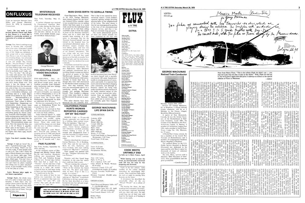 More than just a space for promotion and information, the newspapers featured artworks by more than 60 artists as well as appropriated newspaper headlines, advertisements, articles and comic strips. The Fluxus Newspaper exemplifies the group’s “do-it-yourself” attitude: an approach that is comical, collaborative, interdisciplinary and anti-commercial. The periodical is also an early example of the artist newspaper: a medium which grew out of the underground press movement and flourished in the late ’60s and ’70s as artists sought new mediums for distributing their work.