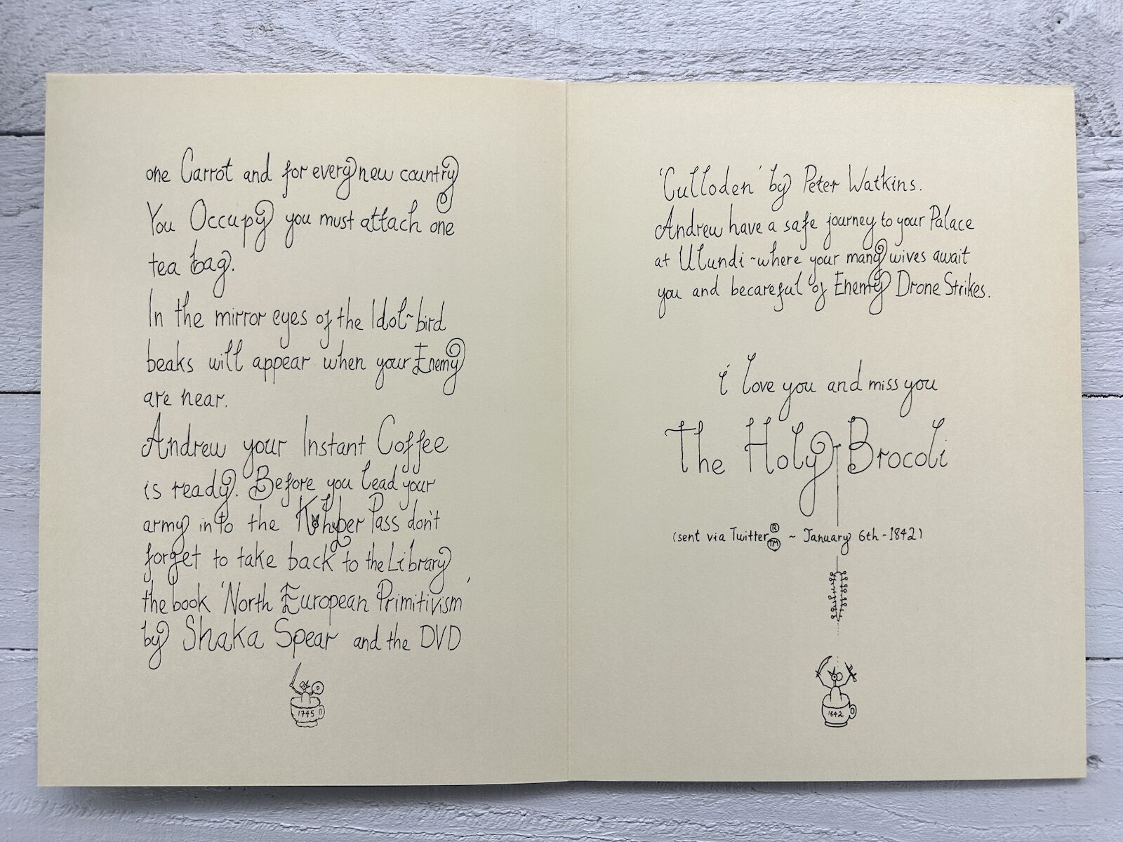 Das Leporello im Festeinband beinhaltet einen Brief des Holy Broccoli an Emperor Andrew Gilbert.