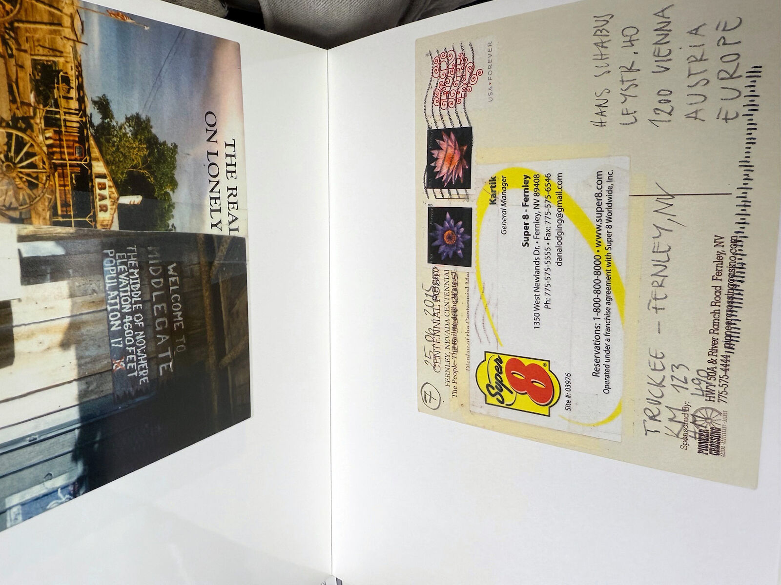 Das Künstlerbuch »The Long Road from Tall Trees to Tall Houses« zeigt alle zweiundvierzig gesendeten Postkarten von beiden Seiten in ihrer ganzen gestempelten Postkartenpracht!