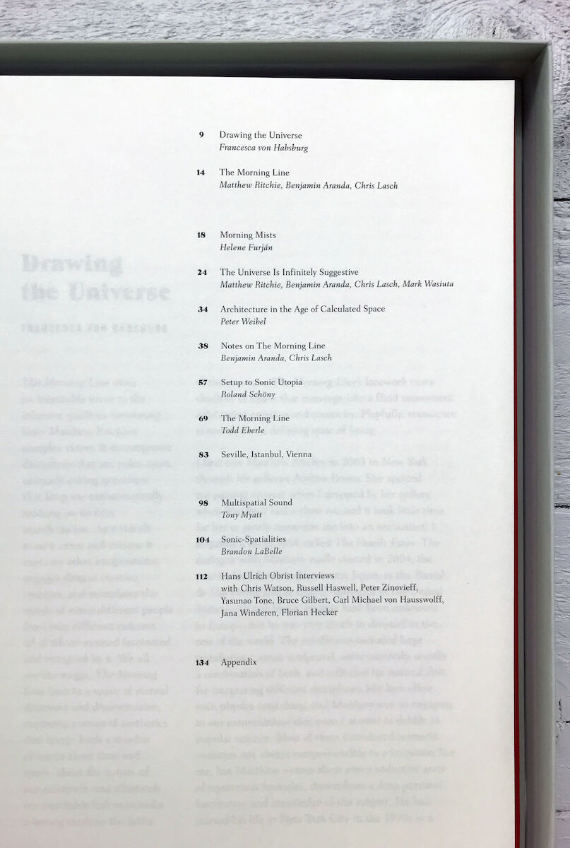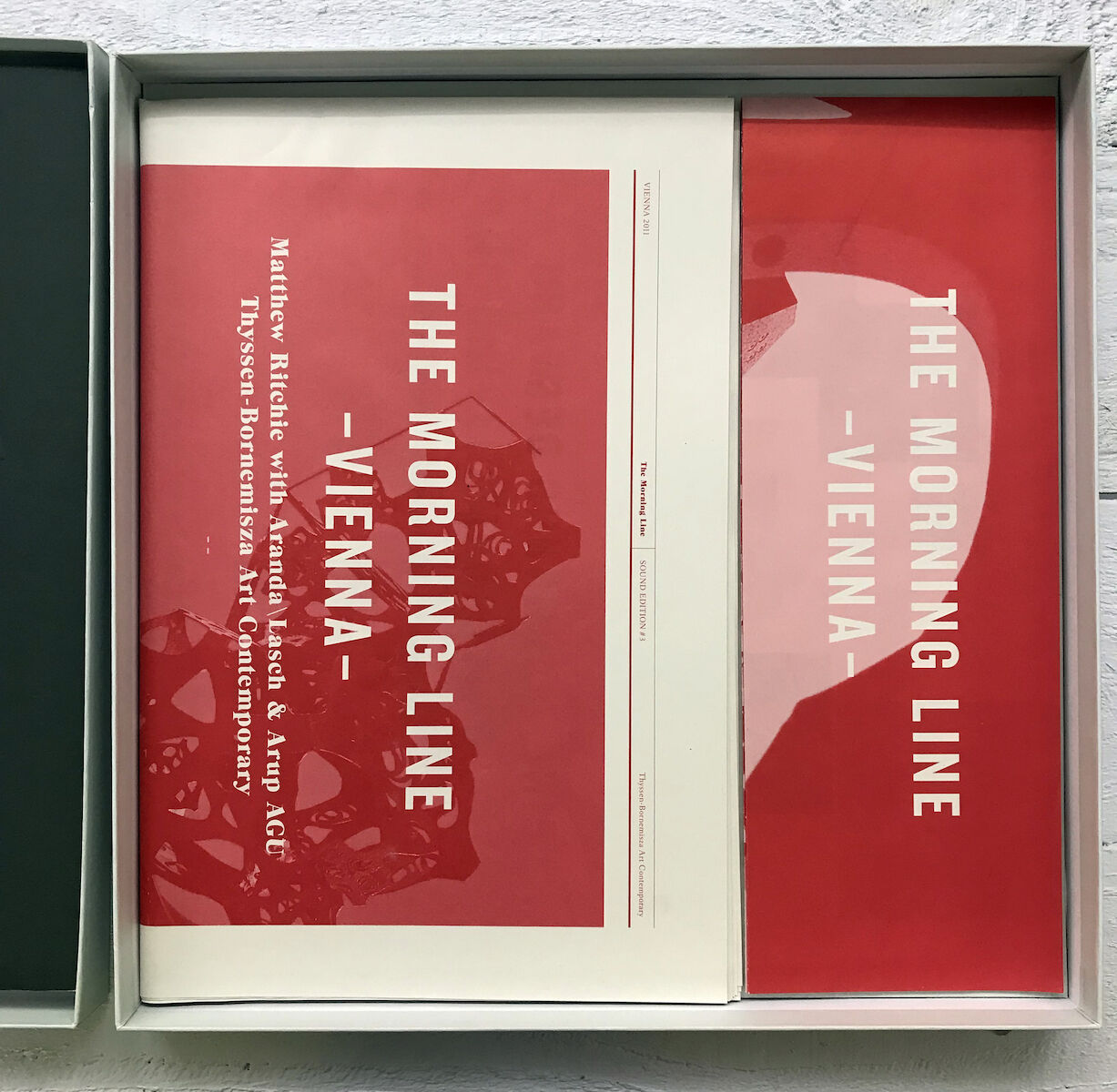 This special edition box includes a vinyl with sound compositions for The Morning Line by Alexei Borisov, Tommi Grönlund & Petteri Nisunen, Christian Fennesz, Carsten Nicolai, Zsolt Olejnik, Finnbogi Pétursson, Terre Thaemlitz, Zavoloka, and Franz Pomassl. Compiled by Franz Pomassl, and a book with texts by Benjamin Aranda, Brandon LaBelle, Helene Furján, Chris Lasch, Tony Myatt, Hans Ulrich Obrist, Matthew Ritchie, Roland Schöny, Mark Wasiuta. Photography by Todd Eberle.
