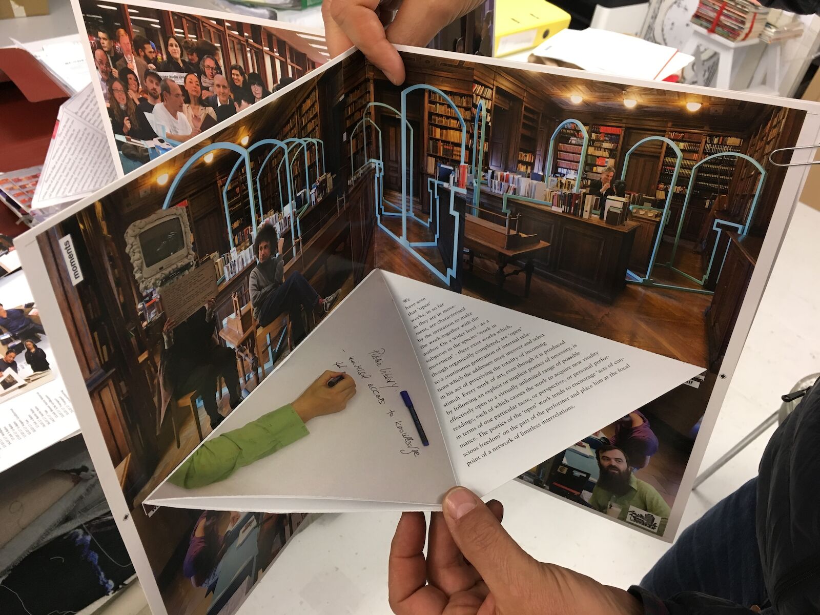 Unlike regular books, in an upright position the cover of The Space Book of Book Space opens a full 360 degrees and, thanks to integrated magnets, seamlessly turns into an object presenting three-dimensional scenery. Like adjoining rooms in a house, its four quarters show three-dimensional snapshots of book presentation rooms and events that shine a light on the process of working with books in the art field.For example, one view shows how books are arranged as an intertextual and cross-object space, another shows their authors gathering around their works in conversation; A third provides a glimpse into how books are arranged to form an exhibition. Finally, Room D is devoted to the legacy of conceptual art and its artistic strategies, ranging from the creation of book objects to performance and happenings. Rooms 7 and 8 address No-ISBN self-publishing in the field of art in the digital age and the emergence of the Internet as a mass medium. Edition of 100. The Space Book of Book Space Concludes an Artist Project.