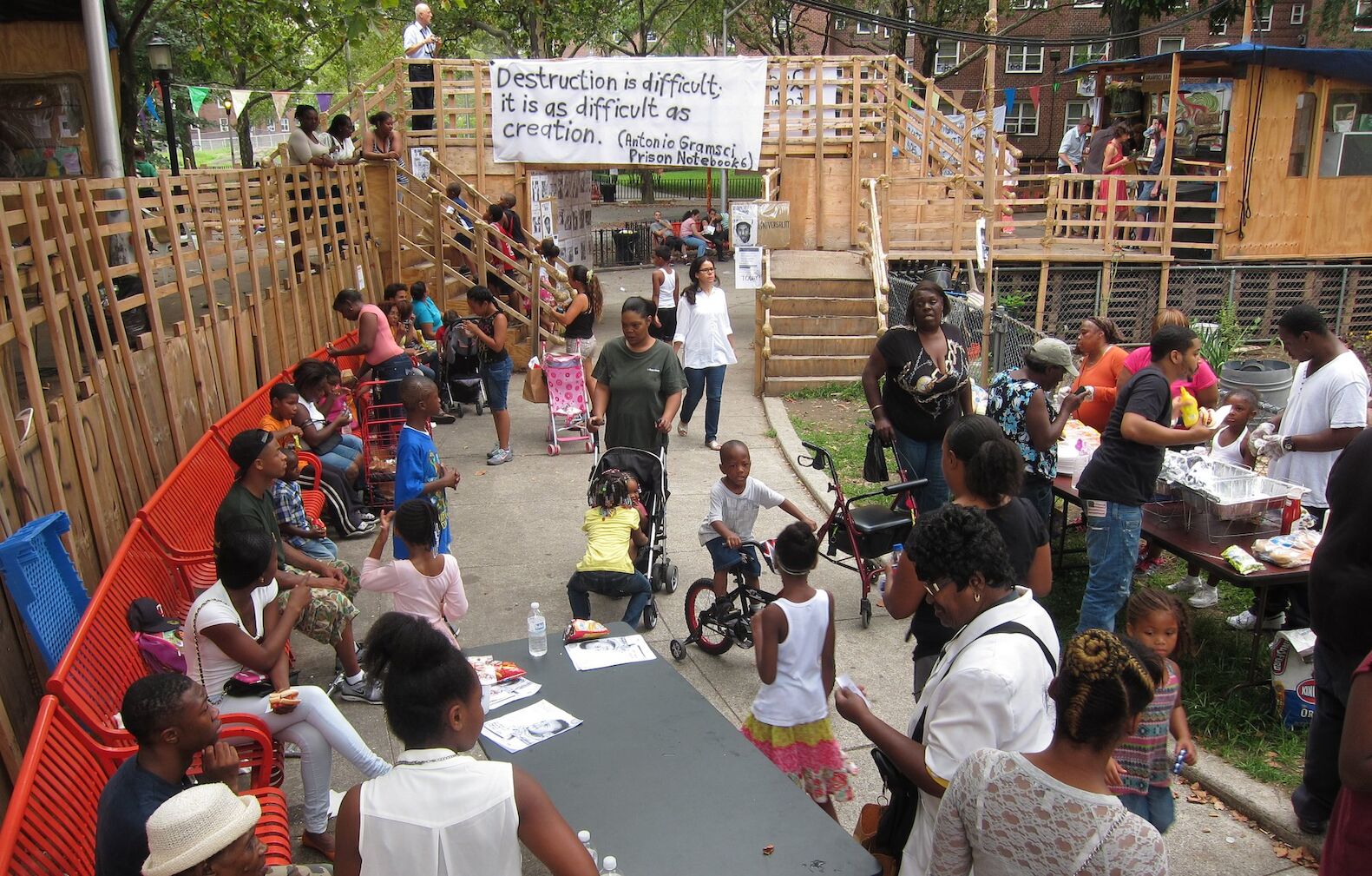 Dia Art Foundation commissioned Thomas Hirschhorn to build Gramsci Monument, an excessive outdoor sculpture that measured 8,000 square feet and was located on the grounds of Forest Houses,in New York (Bronx). On display for 77 days, with daily and weekly events organized by the artist, Gramsci Monument concluded Hirschhorn’s series of “monuments” dedicated to philosophers, which began in 1999.