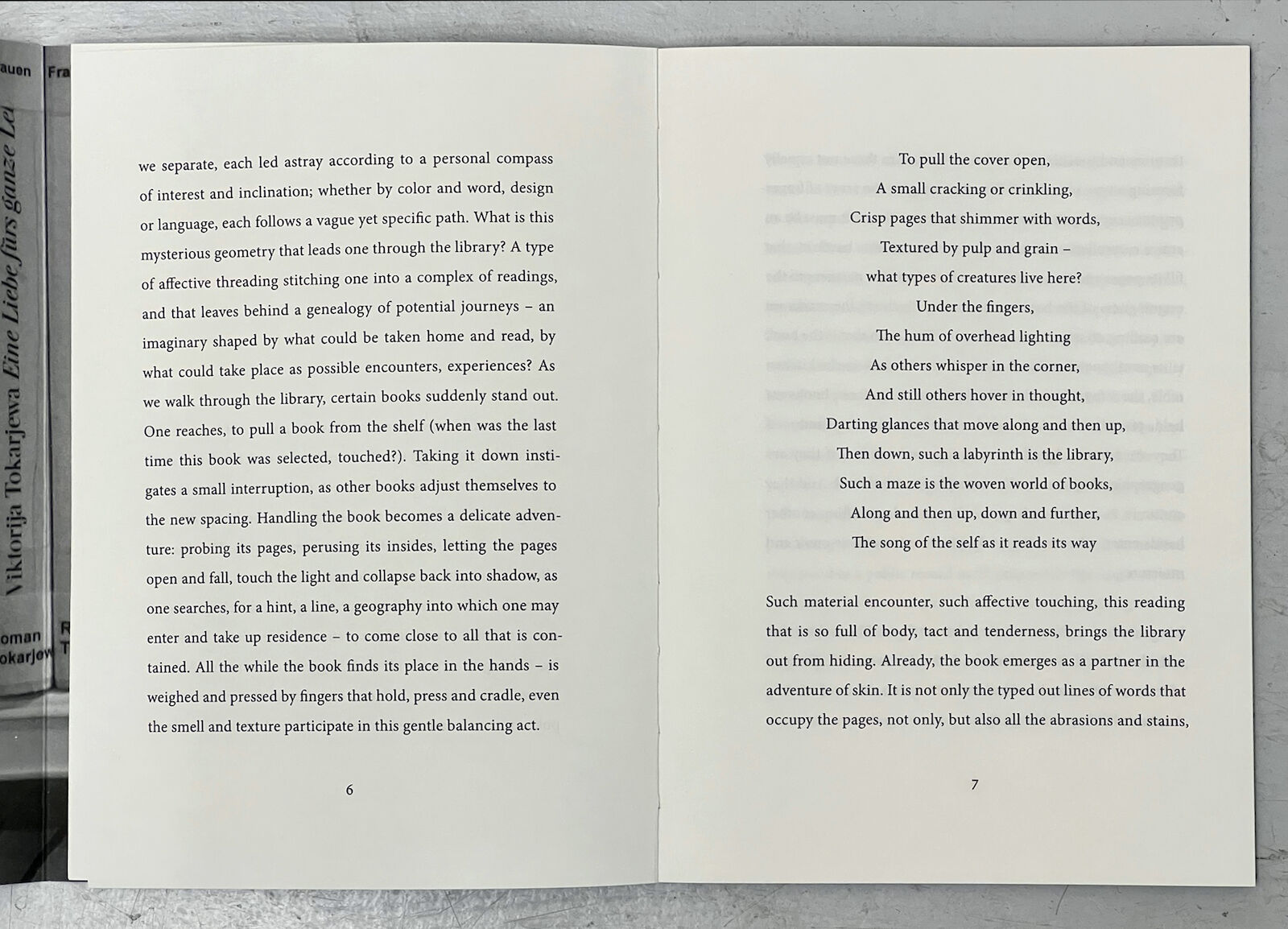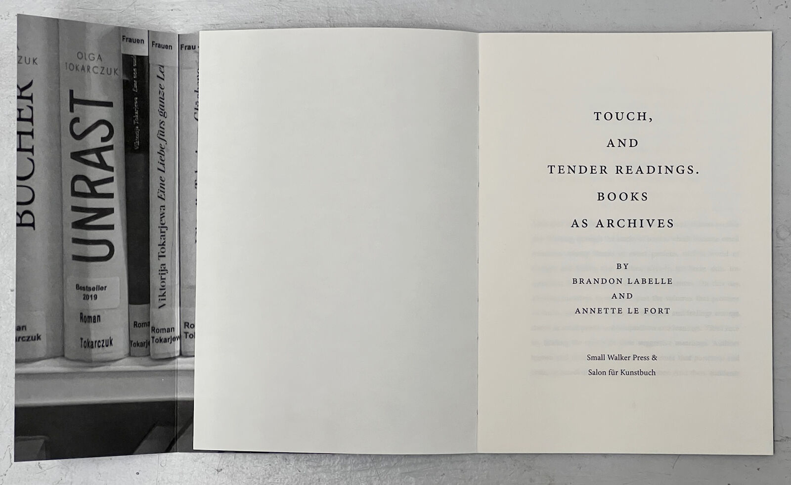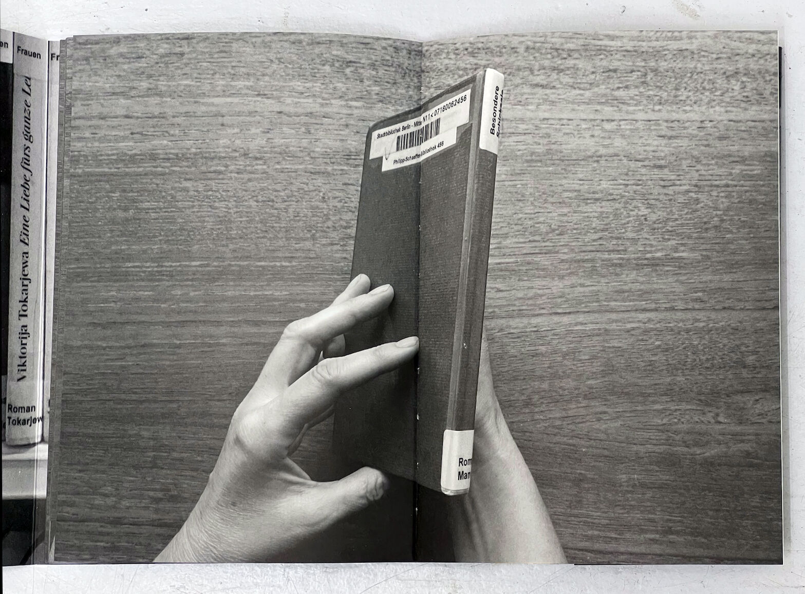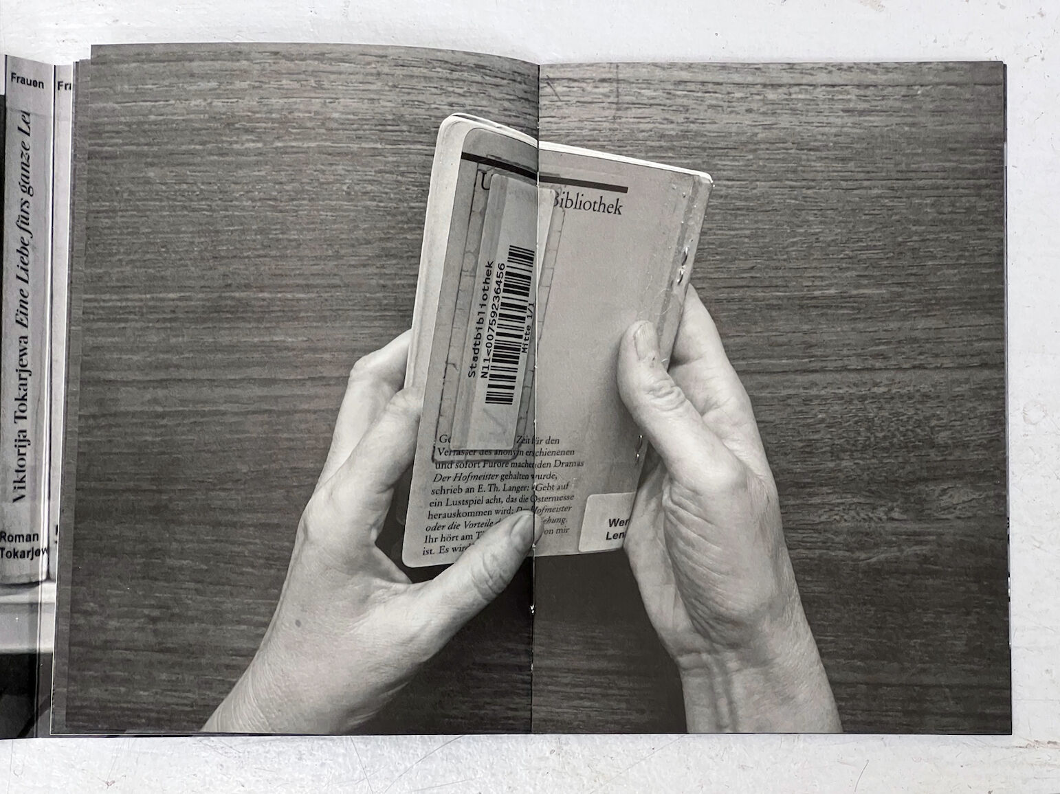 The publication is developed as a reflection on books as archives of touch. Visiting our local public library, the Philipp Schaeffer Bibliothek in Berlin, we checked out a selection of books that caught our attention. Bringing them home, we took photographs of handling and reading the books, which we then printed out and inserted back into the books. Following this, we returned books to the library with these hidden pages added.