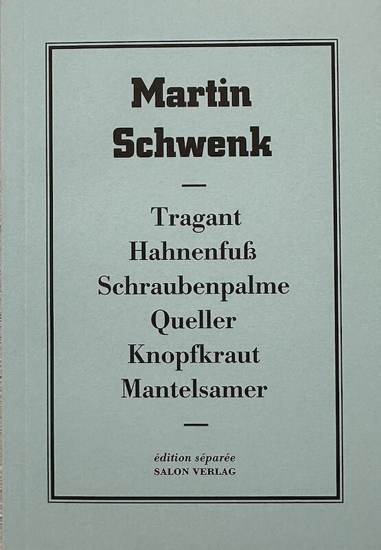In Tragant Hahnenfuß Schraubenpalme Queller Knopfkraut Mantelsamer versammelt Martin Schwenk Zeichnungen, Skulpturenfragmente und botanische Studien, in denen reale Pflanzenformen mit imaginären Organismen verschmelzen.