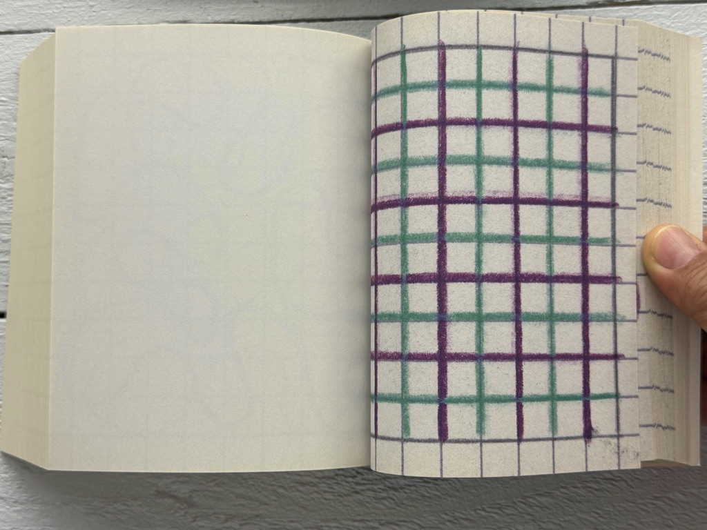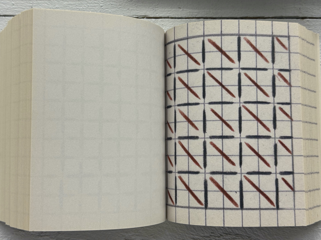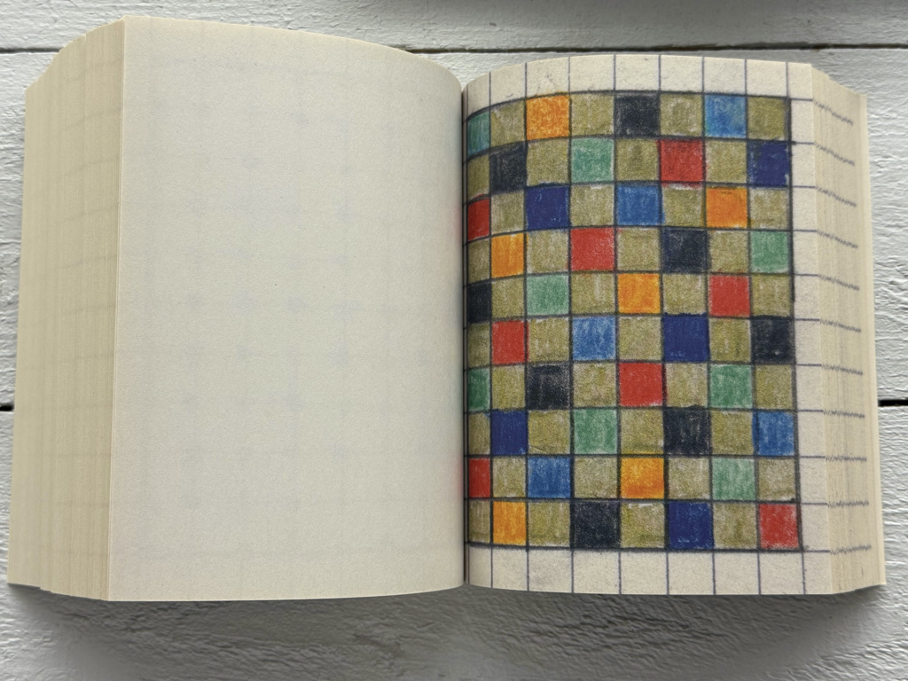 His book Trente Vingt-quatre exemplifies this approach. Within its pages, large squares are drawn inside smaller ones: lines, curves, diamonds, flat rectangles, dots aligned in sequence, angles, grids. Through repetition—on the page and in space—new patterns emerge, rendered in grey pencil or colour. A chessboard of grey and white appears, where form follows the rhythm of the page as much as the artist’s thought process.
