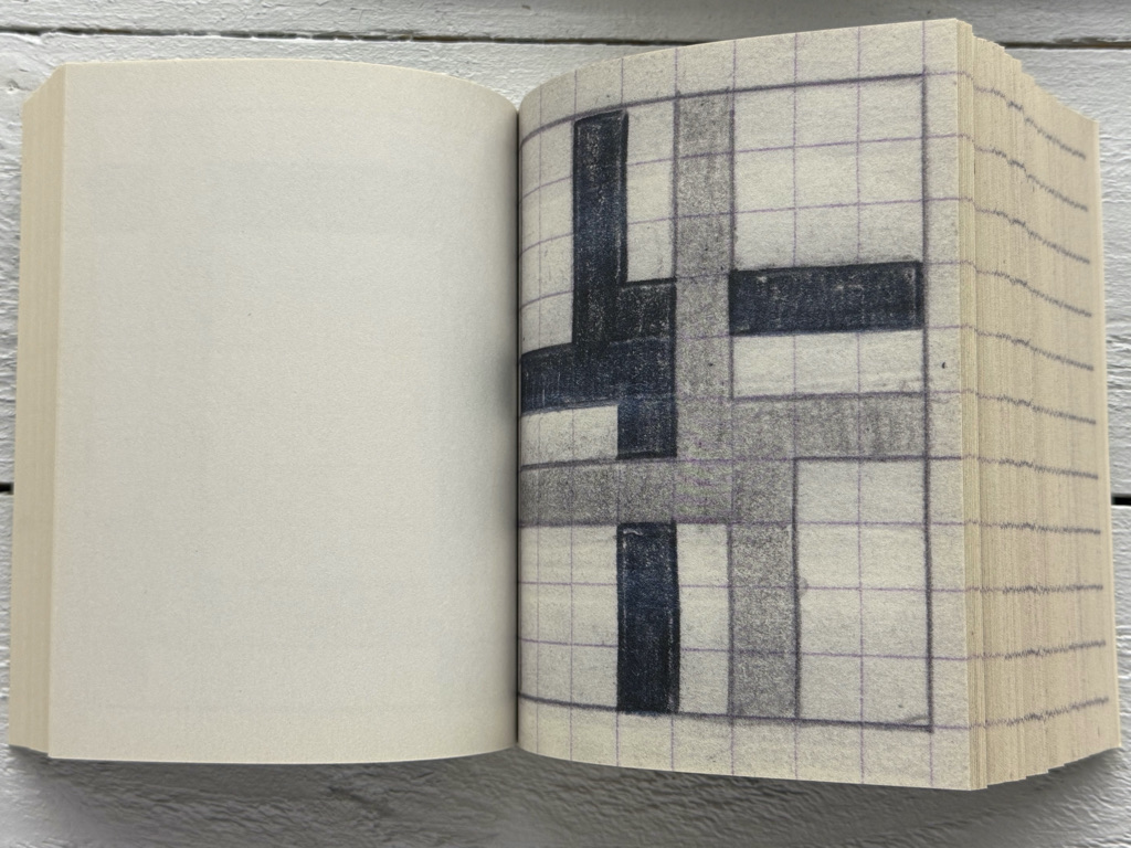 This corpus represents the first stage of a larger research project. The sketches, while serving as preparatory studies for large-scale works, constitute an autonomous body of work in their own right. They are presented without mediation: alignments of forms, transcribed directly from the process of research. To further accentuate this gesture, the artist produced some thirty unique hand-made covers. The sequence of the book follows the chronology of the drawings, structured according to a protocol derived from the reproduction of twelve A4 sheets taken directly from his working binder.