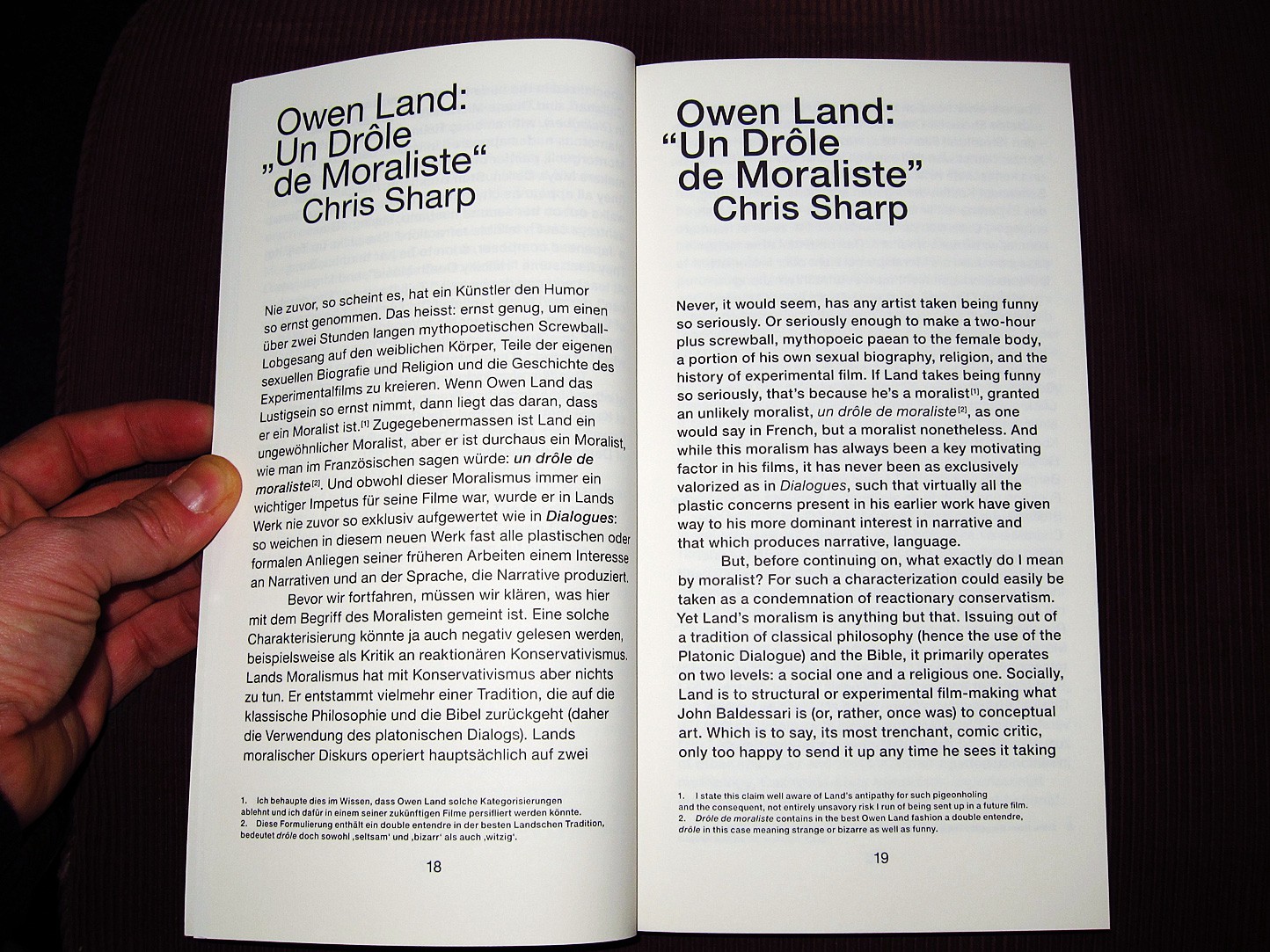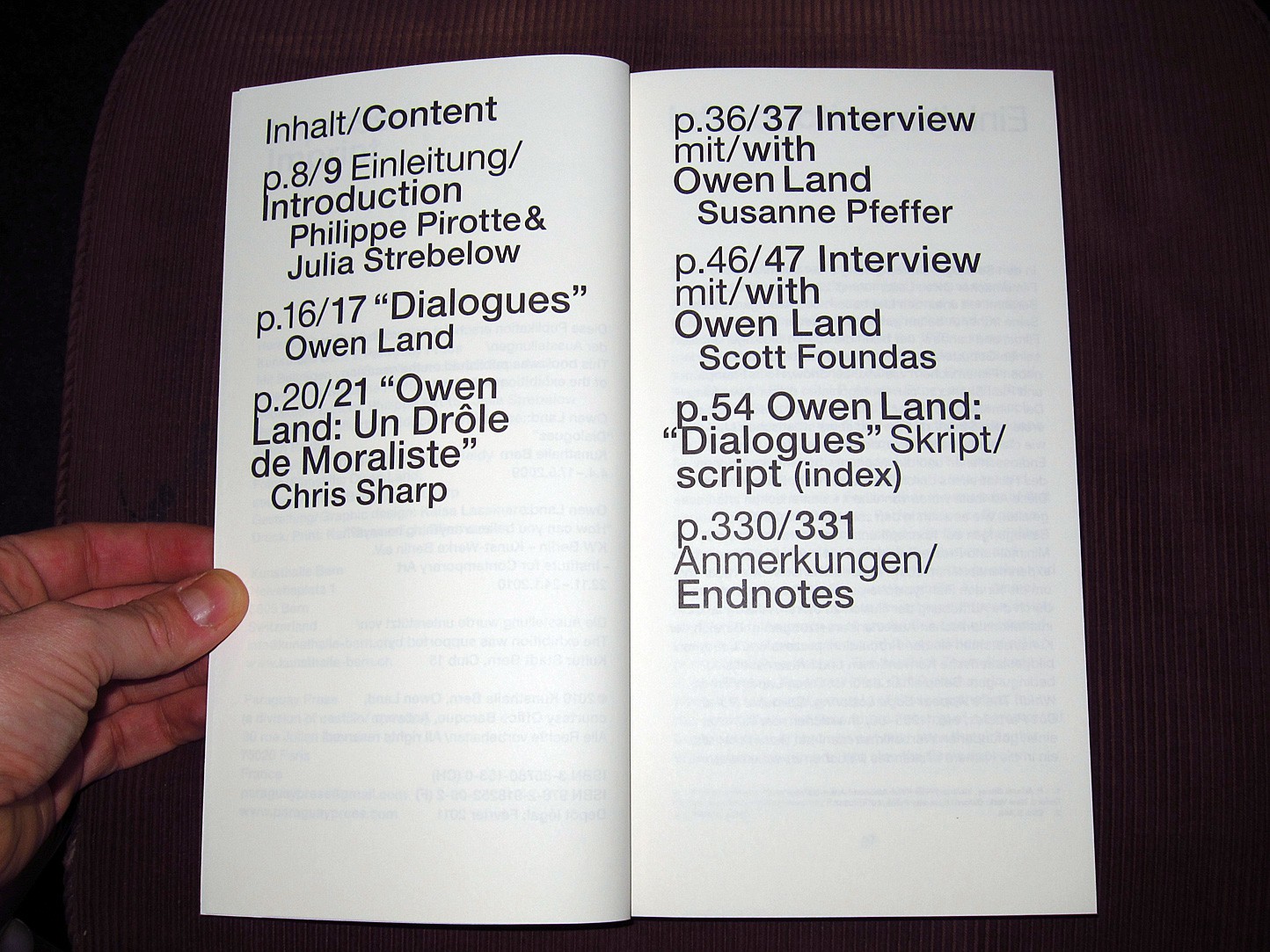 Film in print. From the celebrated director Owen Land 144-2011, American filmmaker. Irreverent, intellectual, dangerous. Kunsthalle Bern 4.4. - 17.5.2009 Owen Land: "How can you believe anything he says?" KW Berlin - Kunst-Werke Berlin e.V. - Institute for Contemporary Art 22.11.2009 - 24.1.2010