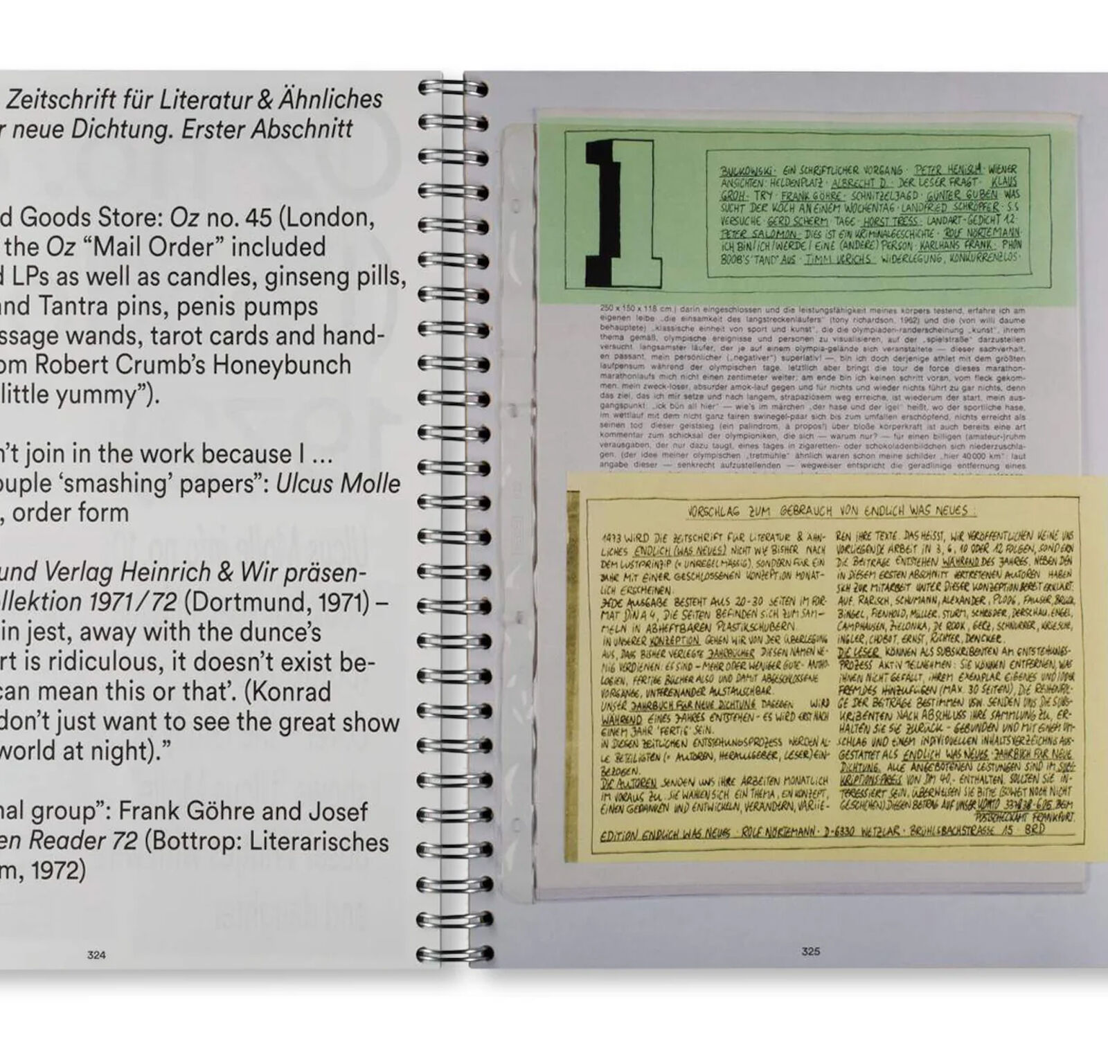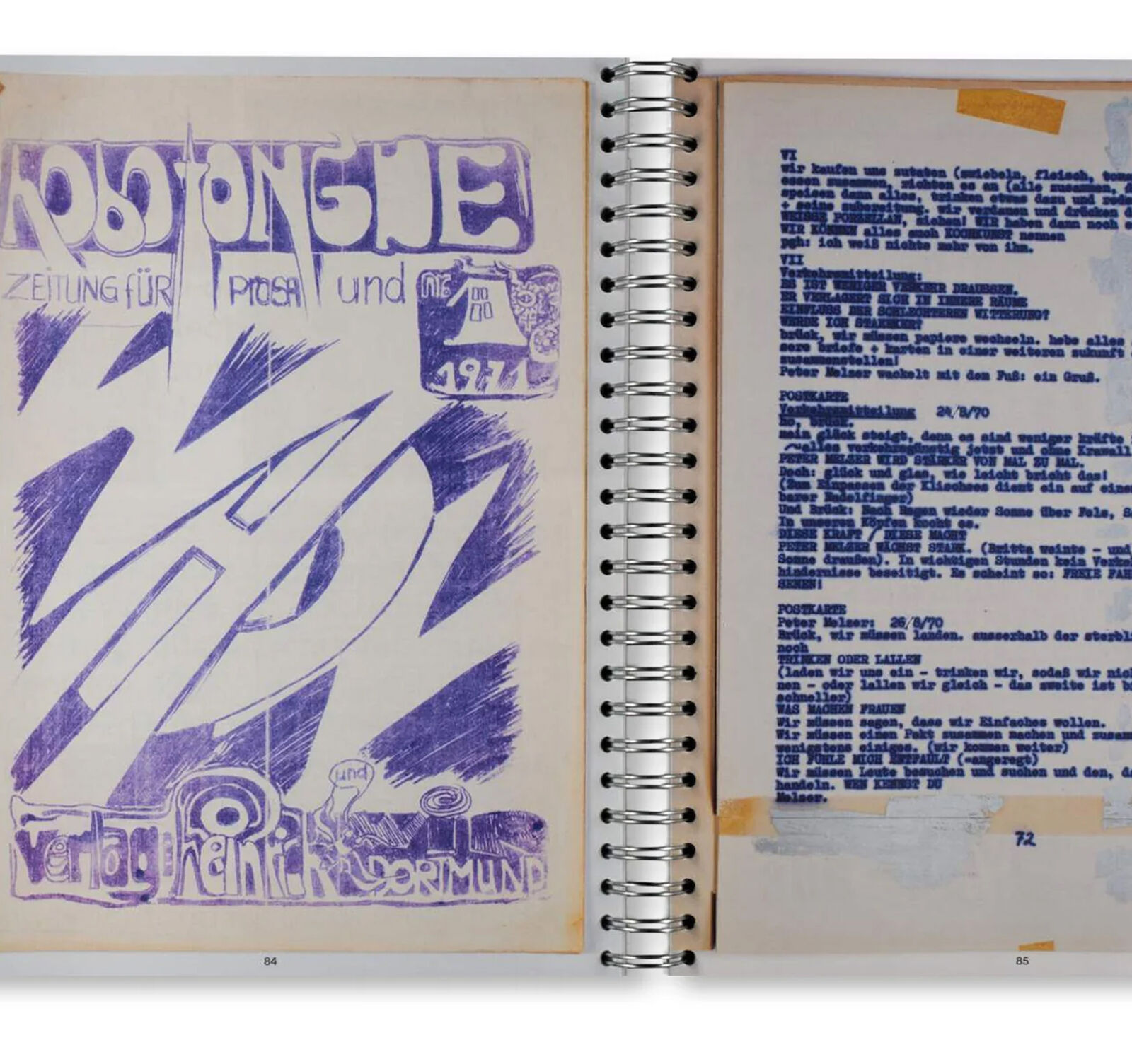 and offset printing not only allowed for the production of small, lowcost print runs but also promote a unique aesthetic: using wild mock-ups, »messianic amateurs« combined typescript aesthetics, handwriting, scribbled drawings, assemblages of collaged visuals, porn photos, snapshots, and comicstrips. The typography consciously frees itself, in parallel to a liberalization of linguistic and visual forms of expression in the name of a new »sensibility«.