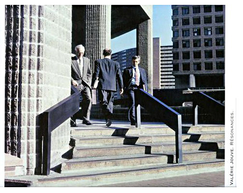 Jouve’s photographs often depict solitary figures embedded in architectural surroundings. Rather than presenting documentary views of the city, the images construct subtle narratives in which bodies, buildings, and public space enter into a dynamic relationship. Through carefully staged or observed situations, the photographs reveal tensions between individuality and collective structures.