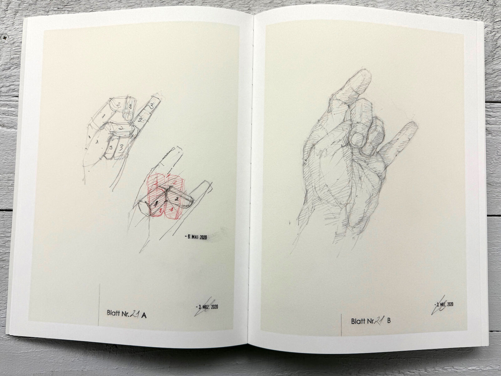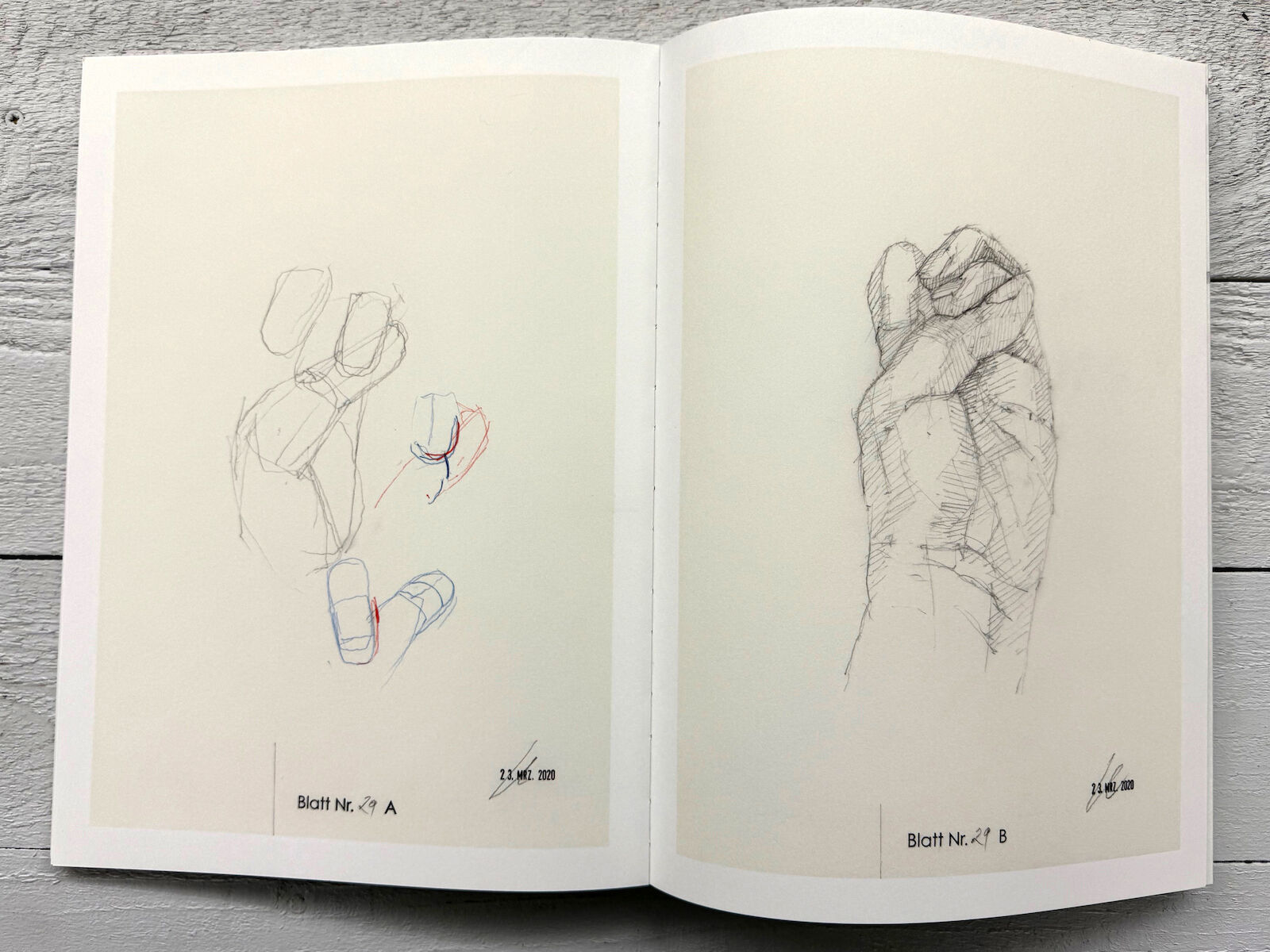 The publication includes around 100 illustrations and texts by the artist in German and English. Its format and construction, with Swiss binding, thread stitching, and a three-part leporello cover, underline its character as an artist’s book rather than a conventional exhibition catalogue.