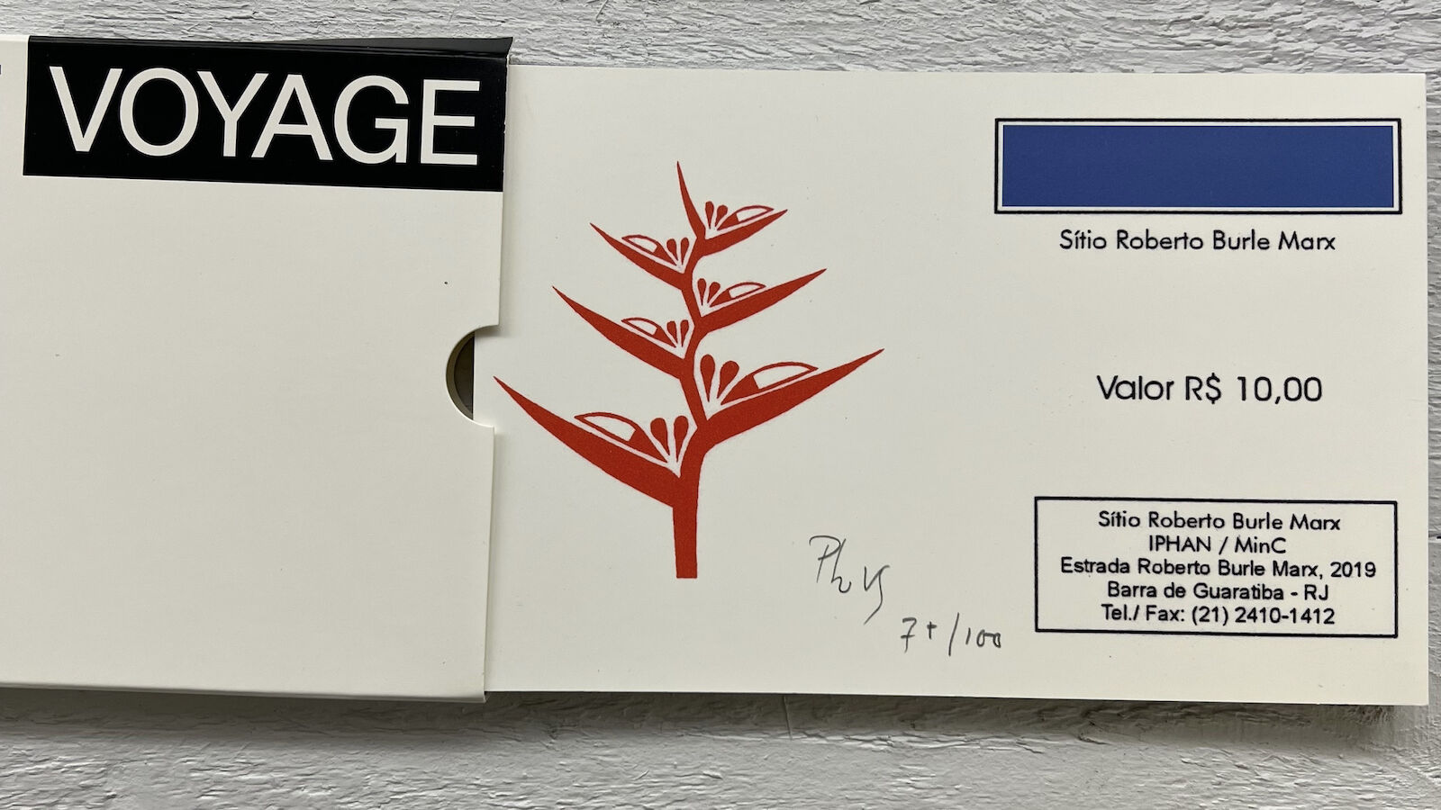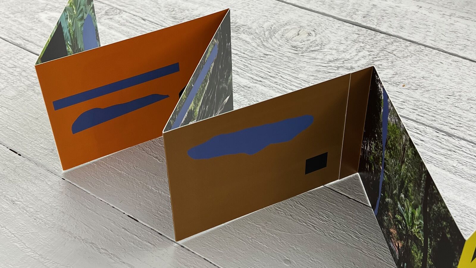 De Hallen Haarlem and Grazer Kunstverein organized two complementary solo exhibitions on the work of Philippe Van Snick (1946). In place of the obligate catalog these two museums published an edition in the form of a concertina. Last year, Philippe Van Snick visited the botanical garden of Rio de Janeiro. From the photos he took there he selected ten, each of which are reproduced on the right page in the leporello. On each left-hand page we find a monochrome surface in a color from the color ten-part system that Philippe Van Snick applied since the eighties (red, yellow, blue, orange, purple, green, black, white, silver and gold). Over this ten diptychs' Van Snick took cutout faces in blue and black, symbolizing the day and night. Sometimes these surfaces are geometric, sometimes organic. This creates a complex interplay of images, colors and symbols. The pictures of the tropical plants contrast with the bright monochrome surfaces, while the typical form of the concertina book reinforces the rhythm of the day and night cycle.