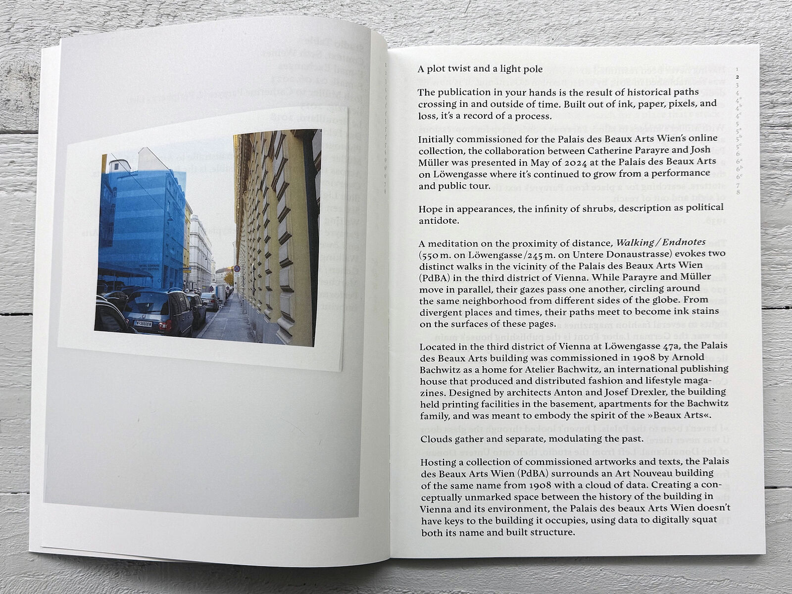 her essay for the project. He sends back 16 photographs produced in response. The essay and images are the result of the collaboration between Catherine Parayre and Josh Müller commissioned in 2024 by the Palais des Beaux Arts Wien for their online collection (#51).