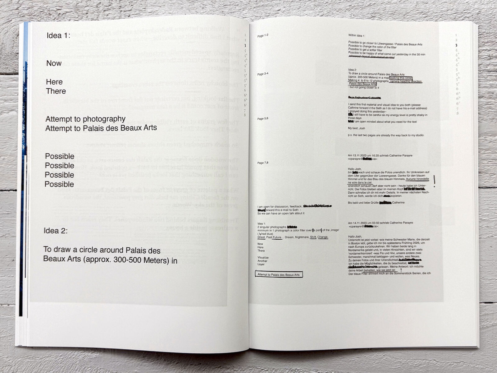 They communicate across the Atlantic by email, no phone. She initiates the collaboration by sending an essay (by Perec). He replies with five photographs and a list. Months pass. She sends