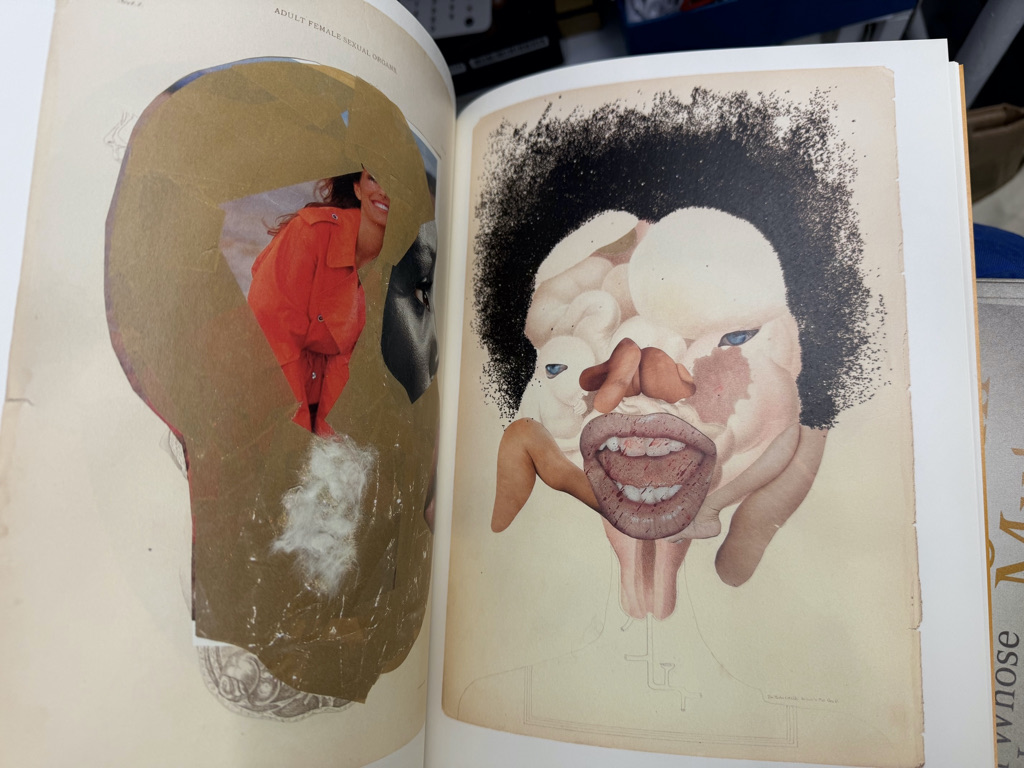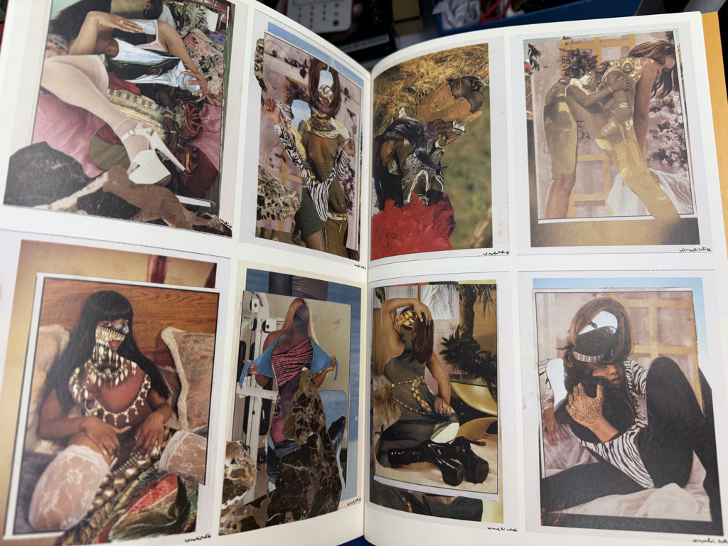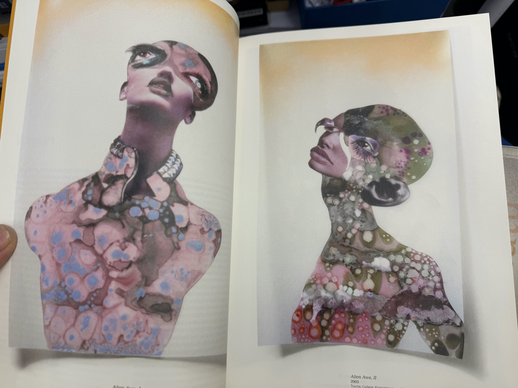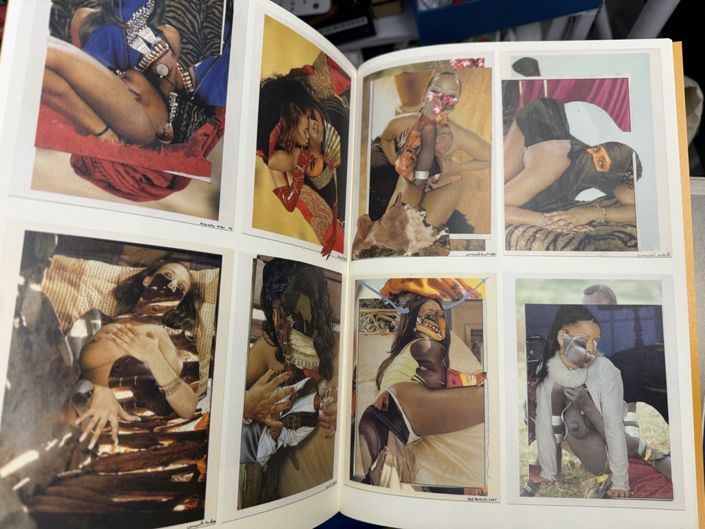 The publication highlights Mutu’s engagement with visual culture and the body, bringing together reproductions of key works that use materials such as ink, magazine clippings (from fashion, science, and other sources), glitter, packing tape, and animal fur.