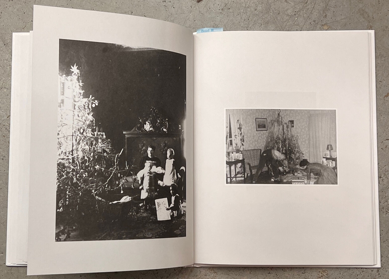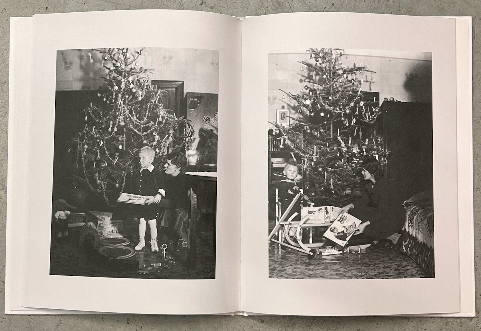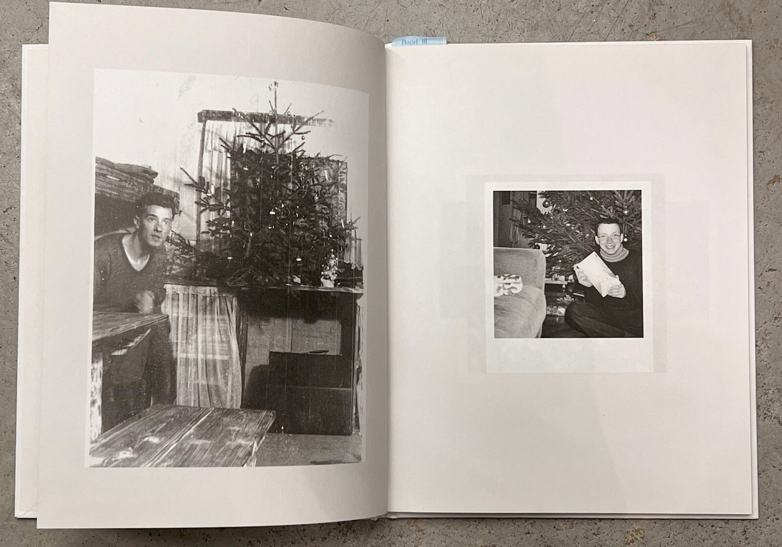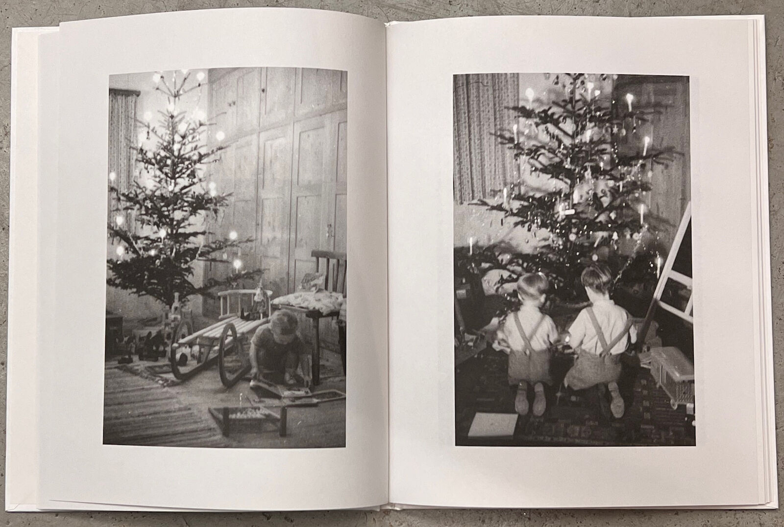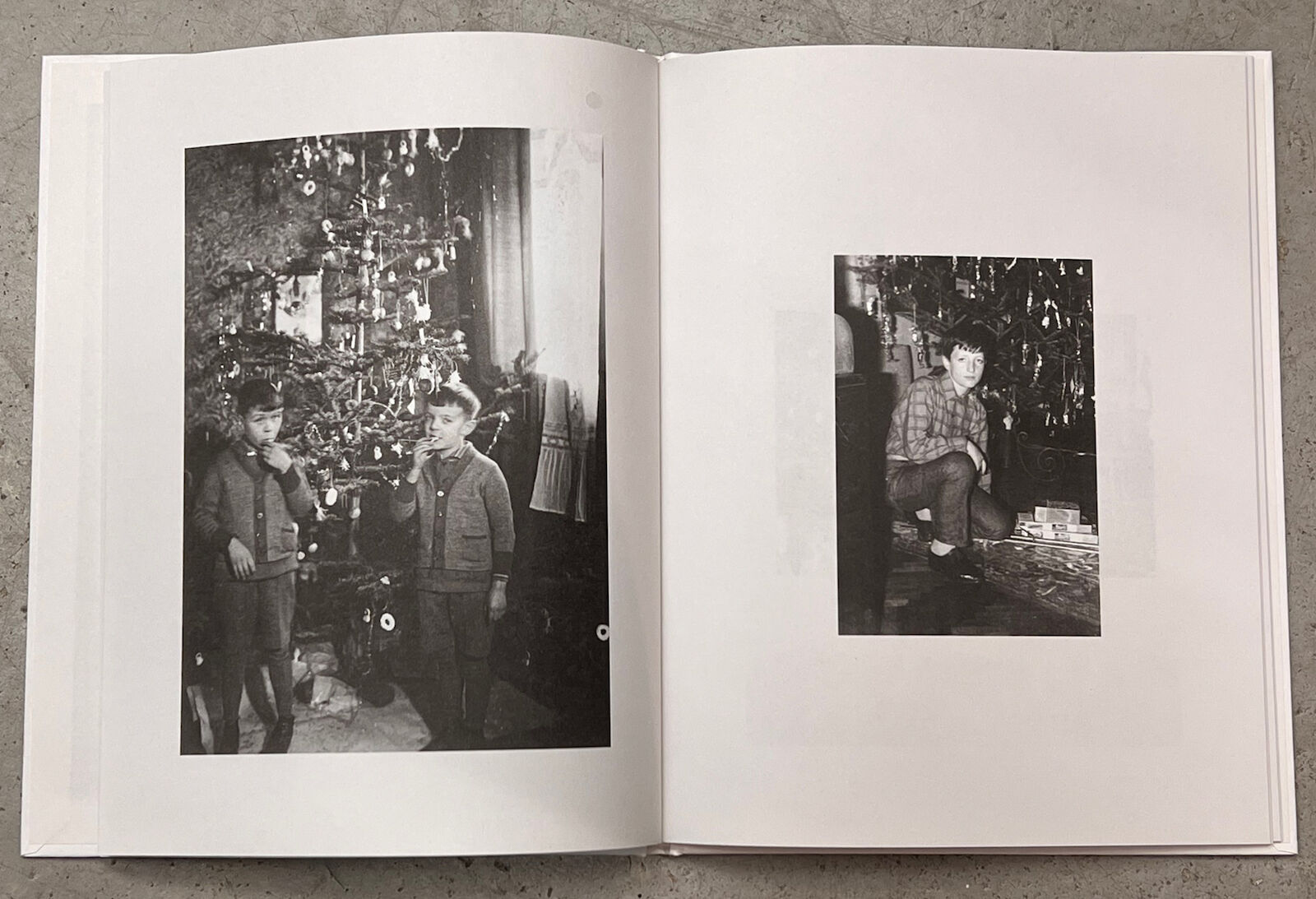 Photos not only capture ritualized moments in images, but they also serve to document the changes over time. Looking at photos from past years in front of the self-made backdrop with a Christmas tree can evoke personal memories. The three photo books present a visual chronicle, composed of full-sized images that describe a bygone society. It contains anonymous photos of Christmas trees in black and white.
