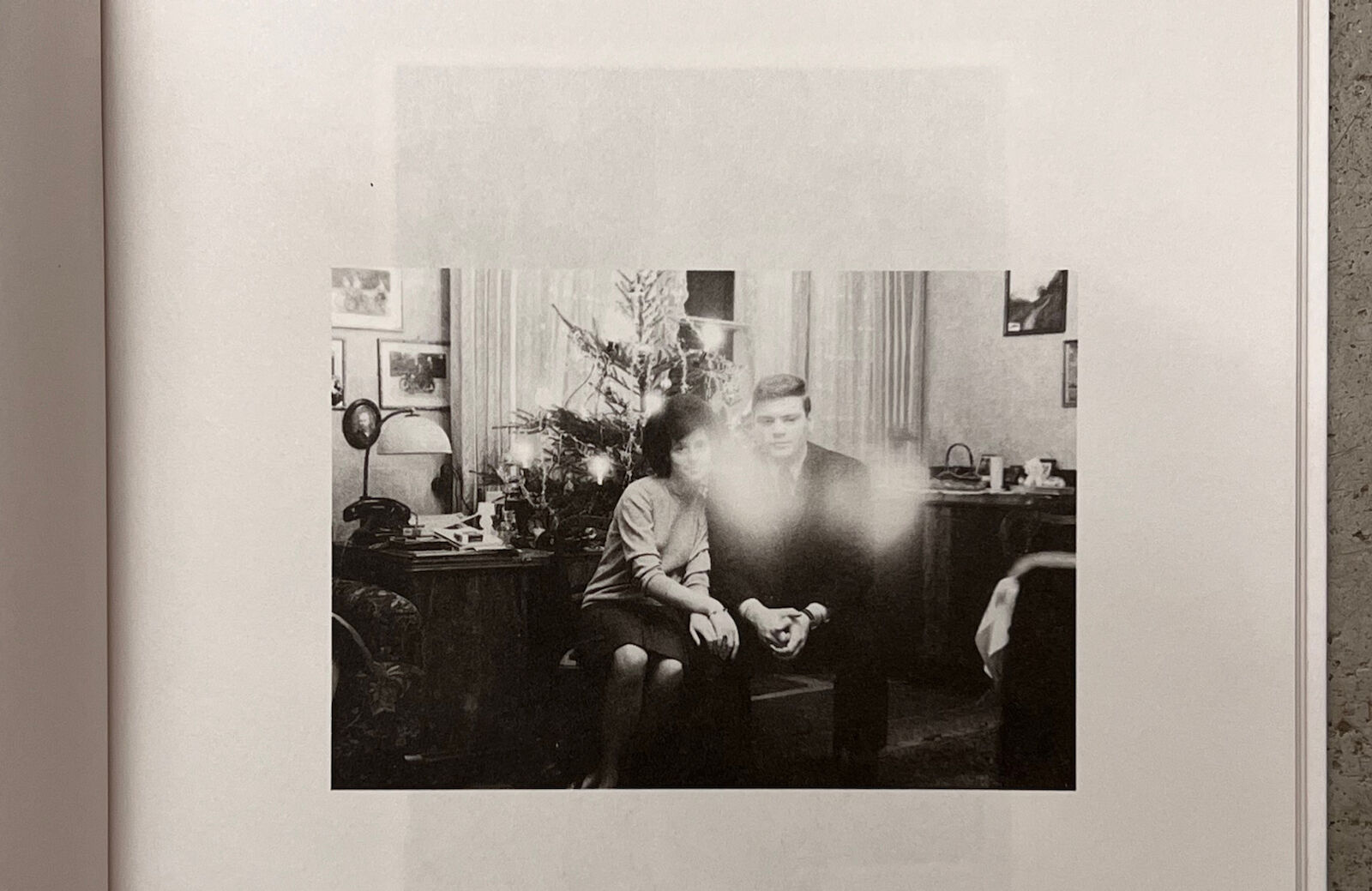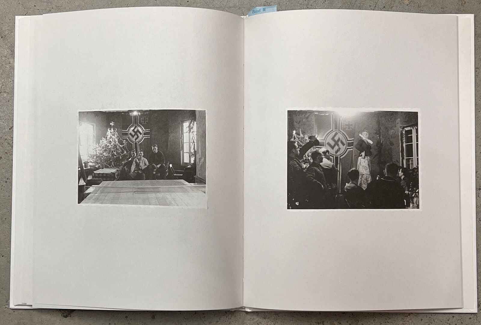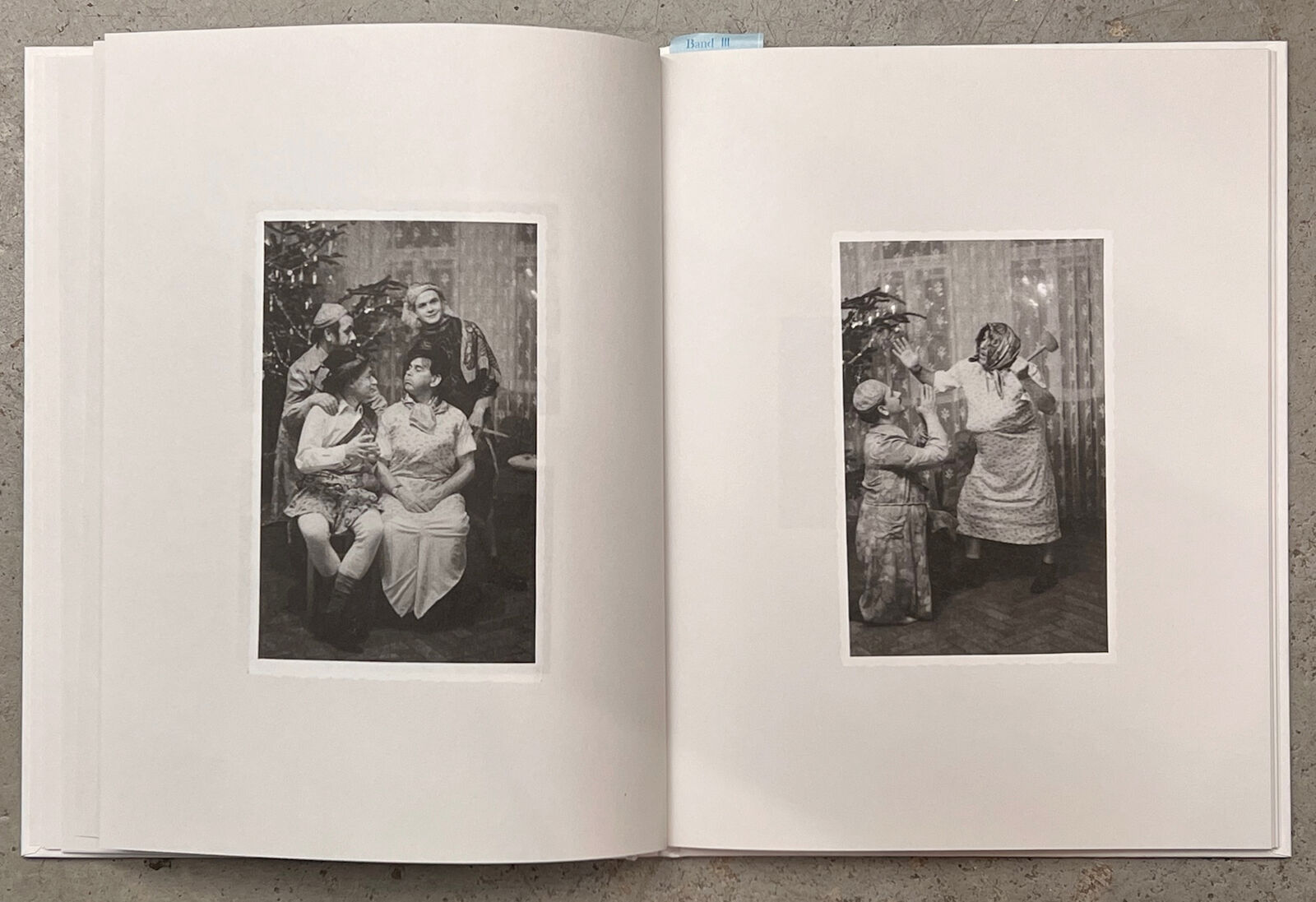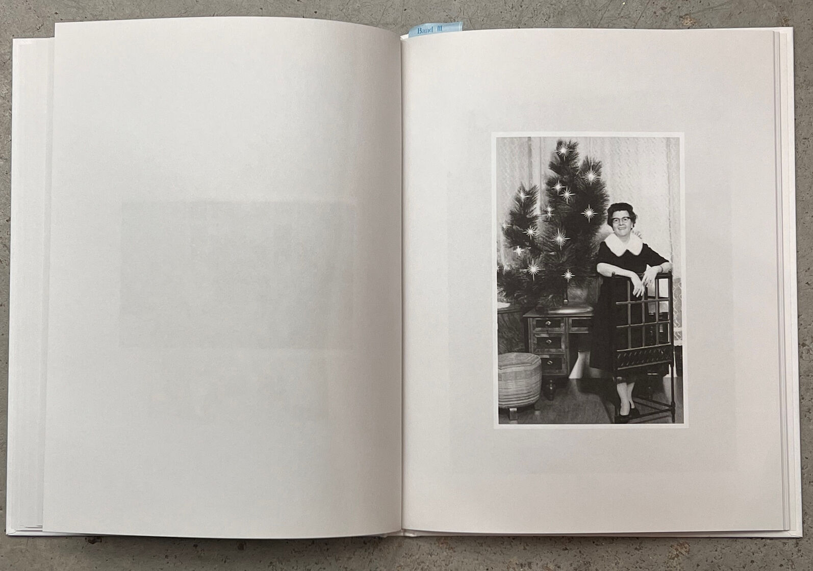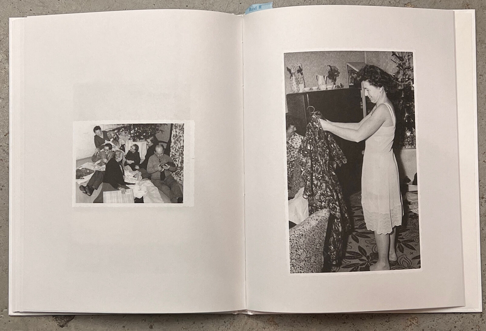 Photos not only capture ritualized moments in images, but they also serve to document the changes over time. Looking at photos from past years in front of the self-made backdrop with a Christmas tree can evoke personal memories. The three photo books present a visual chronicle, composed of full-sized images that describe a bygone society. It contains anonymous photos of Christmas trees in black and white.