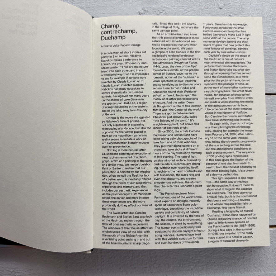 Das Schweizer Künstlerpaar Caroline Bachmann und Stefan Banz fotografierte mehrere Jahre lang vom gleichen Ort aus, was in entgegengesetzter Richtung zu sehen ist: die atemberaubende Aussicht, der Duchamp damals den Rücken zukehrte. Dieses Buch versammelt 100 Farbfotografien von Genfersee und den Waadtländer-, Walliser- und Savoyeralpen in chromatischer Abfolge. Ein Essay beschreibt, was es mit Duchamps Meisterwerk auf sich hat und warum er gerade diesen Wasserfall auswählte.
