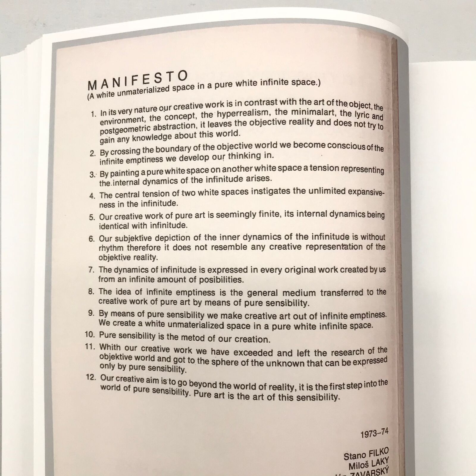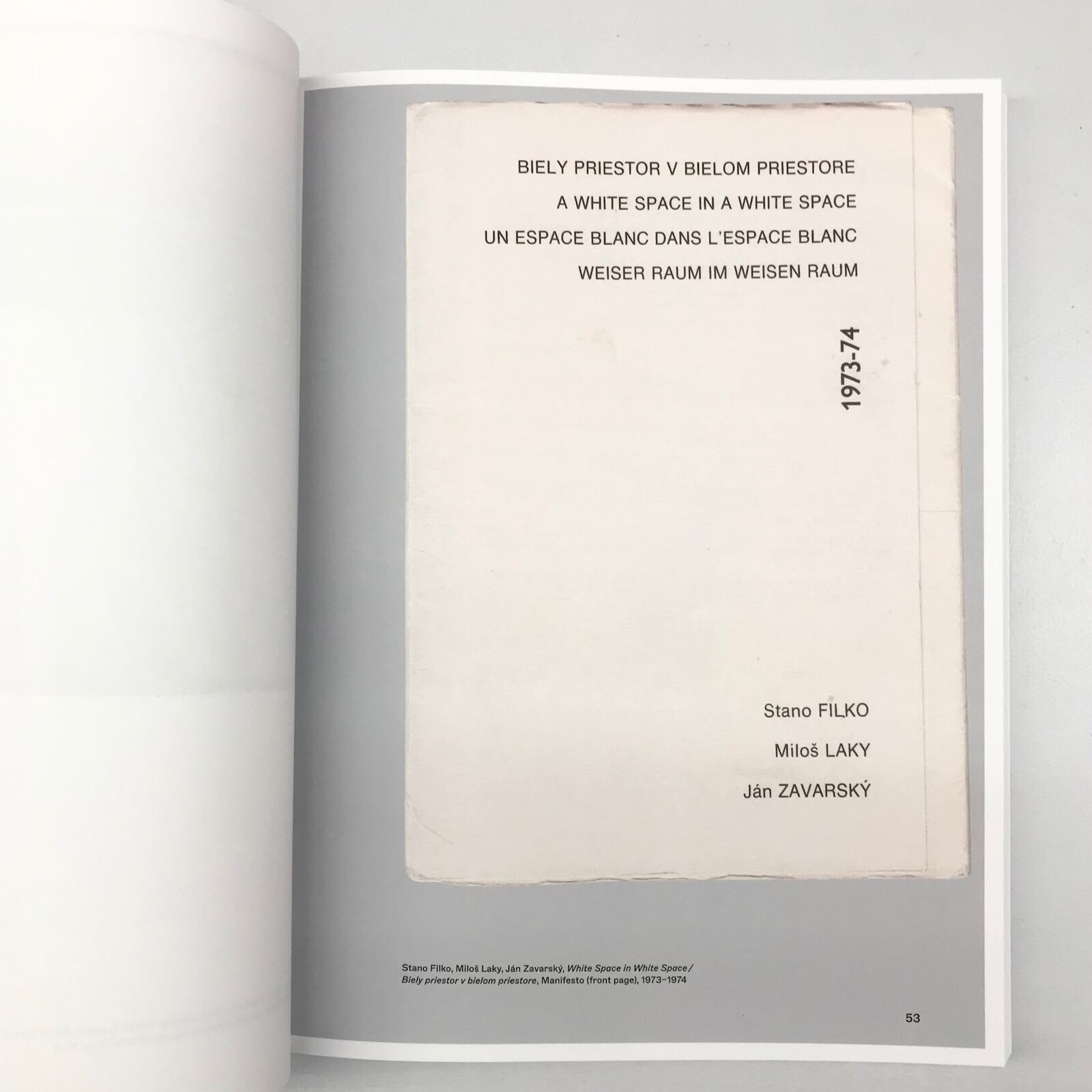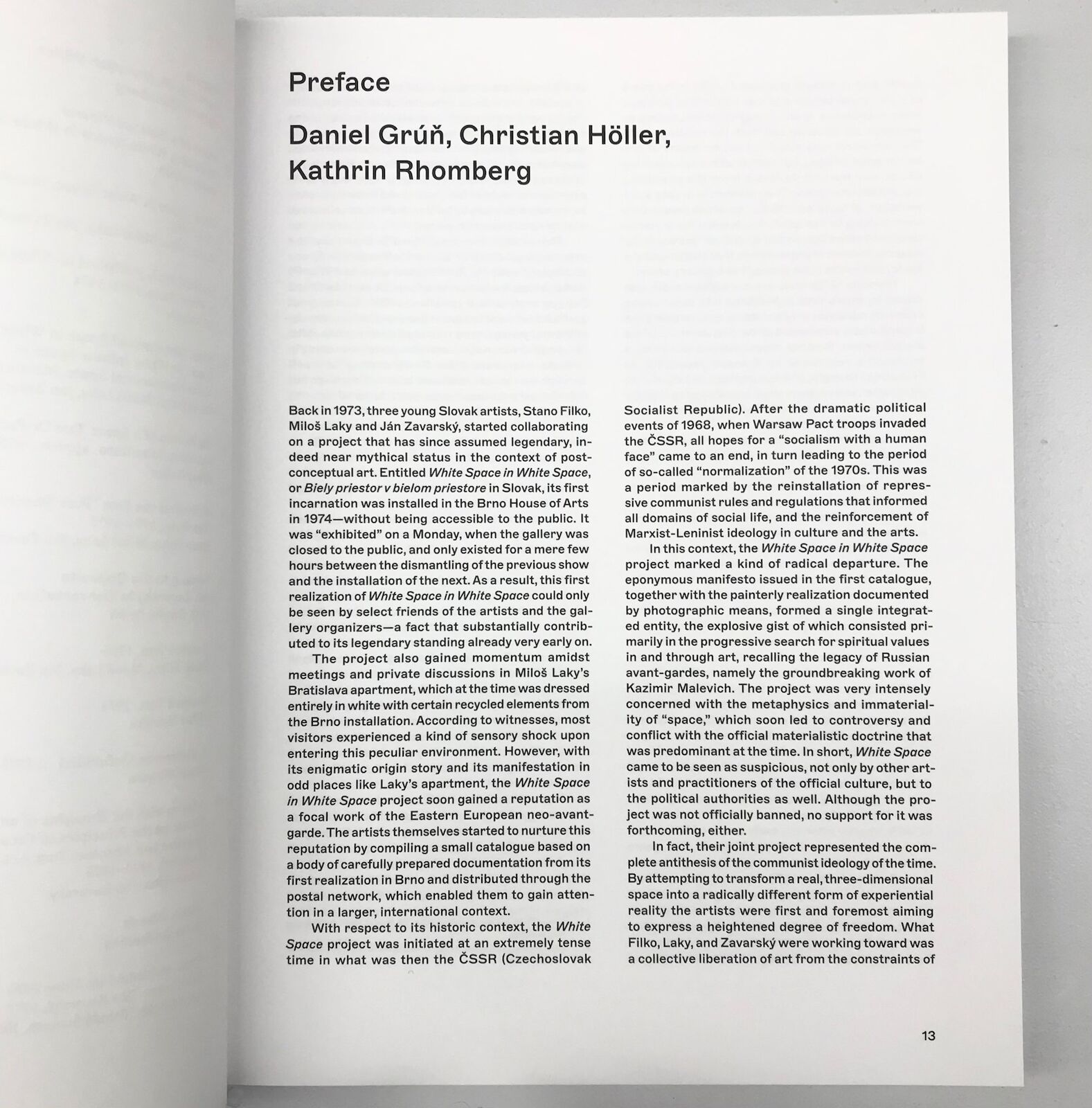 Die Publikation ist die erste umfassende Dokumentation des 1973 von Stano Filko, Miloš Laky und Ján Zavarský initiierten und sich über fast ein Jahrzehnt entwickelnden Projekts White Space in White Space. Sie berücksichtigt alle internationalen Ausstellungen (Brünn, Budapest, Paris, Warschau, Belgrad, Kassel), gesammelten Manifeste sowie Schriften der Künstler wie auch die weitere Transformation des Projekts in der eigenständigen Kunstpraxis von Stano Filko. Der „weiße Raum im weißen Raum“ wird in Essays, Interviews und Kommentaren unter verschiedenen Aspekten interpretiert, nicht nur um seinen Platz innerhalb der osteuropäischen Konzeptkunst zu markieren, sondern auch um sein Vermächtnis für die zeitgenössische Kunst und die gegenwärtige institutionelle Praxis hervorzuheben.