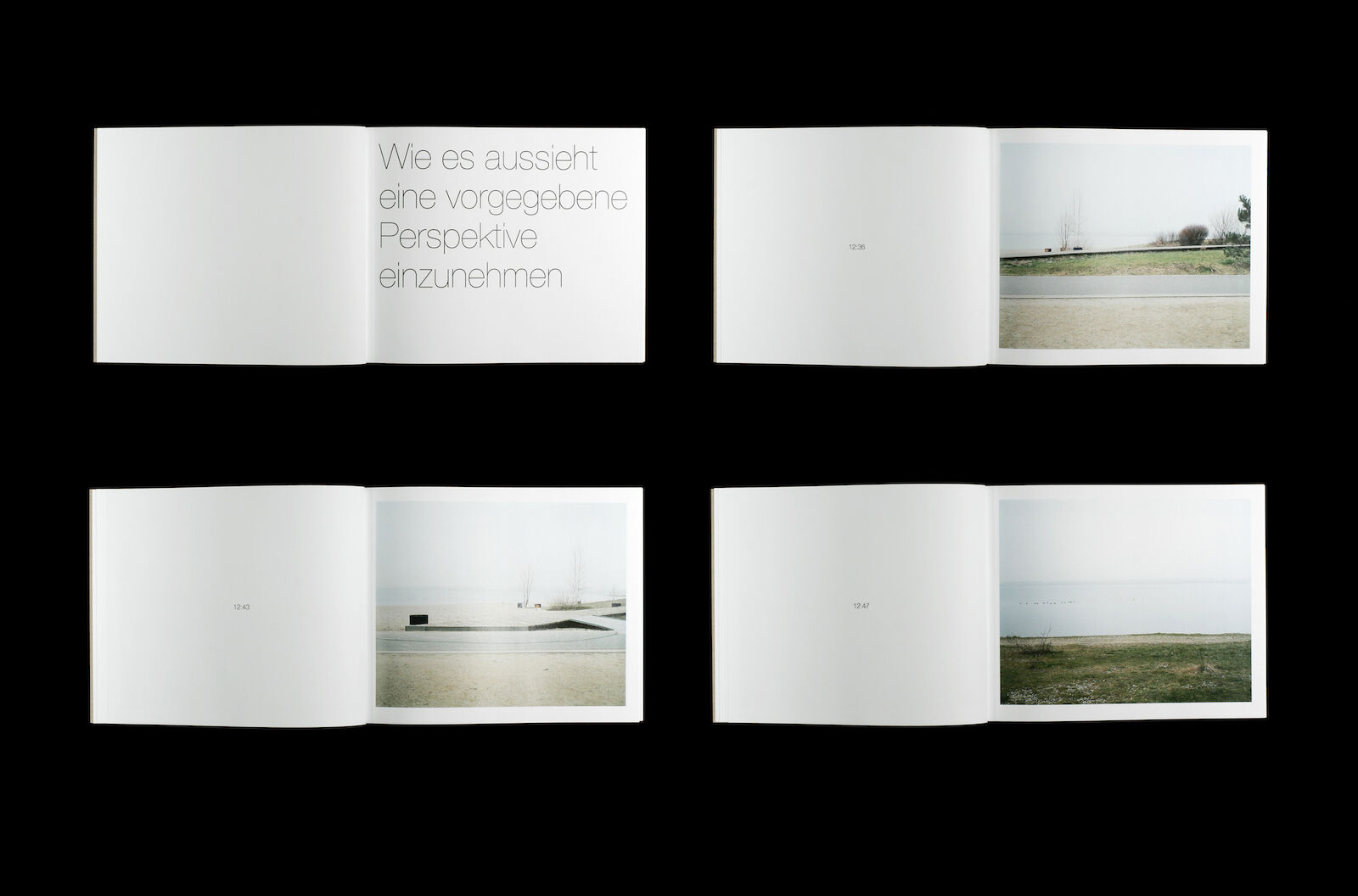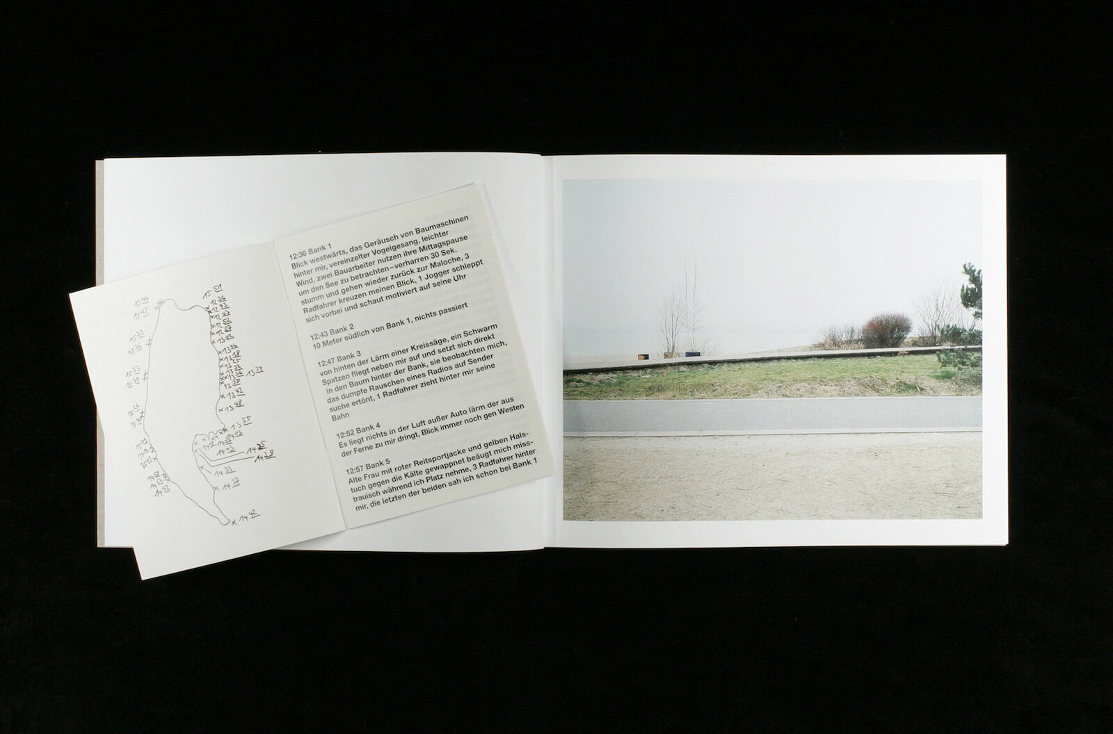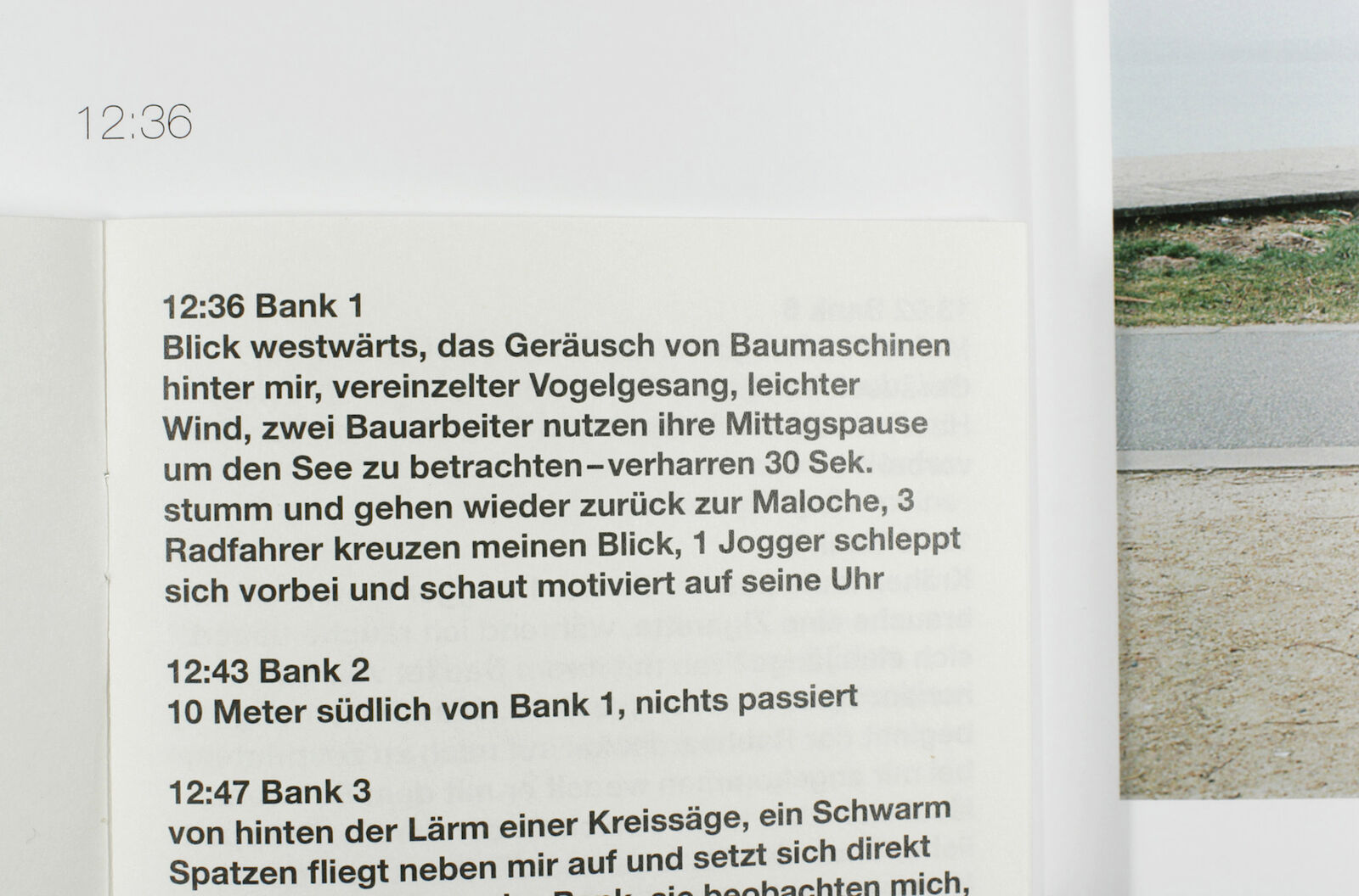40 Fotografien, die eine Tagebaufolgelandschaft zeigen. Einer Bewegung folgend in un/regelmäßigen Abständen aufgenommen. Die Uhrzeit der Aufnahme. Ein Zirkelschluss. Das beigelegte Protokoll klärt über die Struktur der vorgegebenen Perspektive auf: von Bank zu Bank dem geplant kontemplativen Landschaftsbild nach. Pro Bild und Bank eine Notiz, die nun gegengelesen werden kann. In Form einer lakonischen Protokollierung der Rahmenbedingungen der Aufnahme tritt dem scheinbar objektiven Blick der Kamera eine zweite Ebene gegenüber. Diese kann das Gezeigte und dessen Bedeutung erweitern oder aber auch dem Bild mit seinem Informationsgehalt an sich widersprechen.