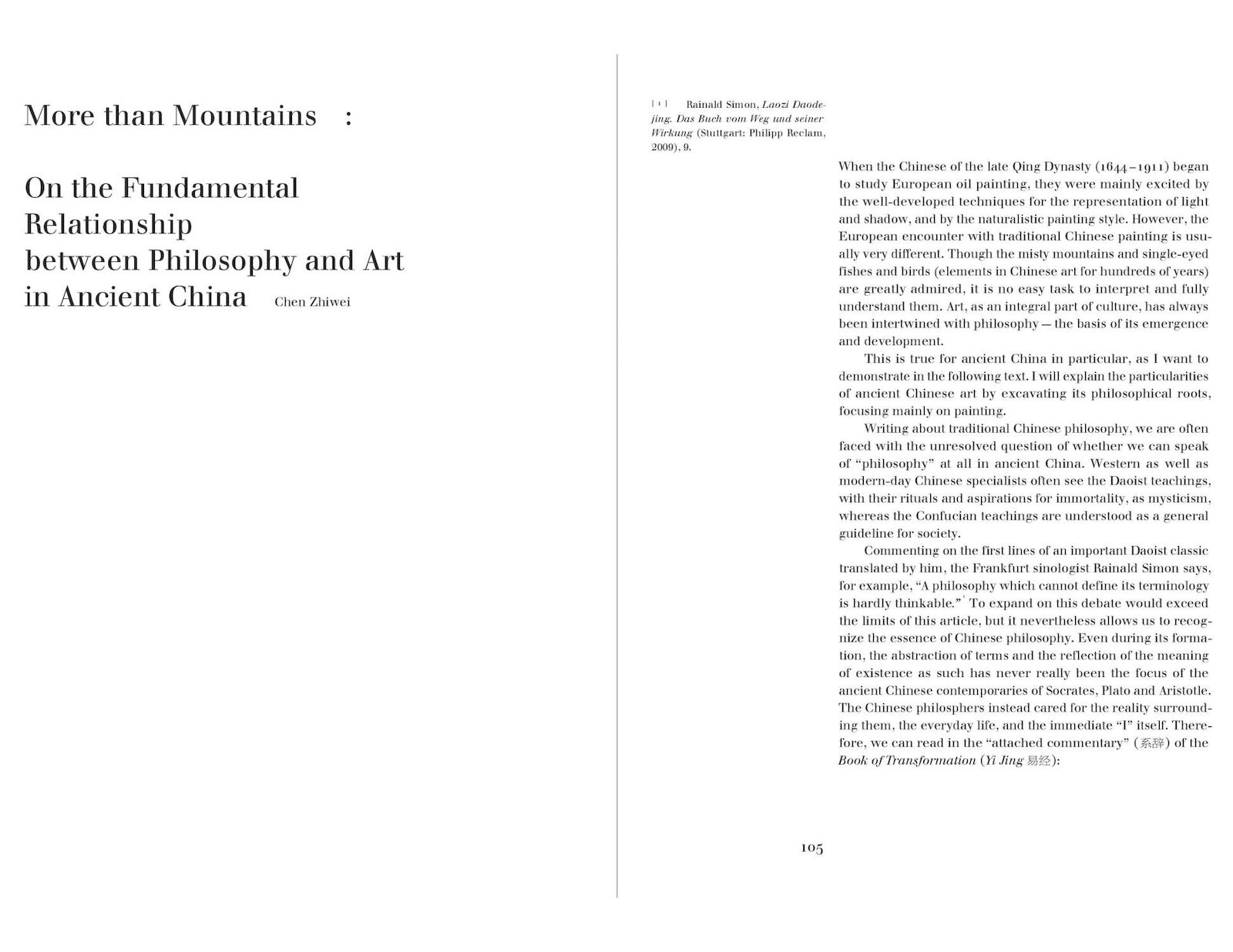 This book is the result of intellectual and physical journeys that artists, scholars, teachers, and students from China and Germany have undertaken together, in order to gain a better understanding of the connections between old Chinese philosophy (with an emphasis on Daoist writings), traditional Chinese painting, and contemporary art practices.