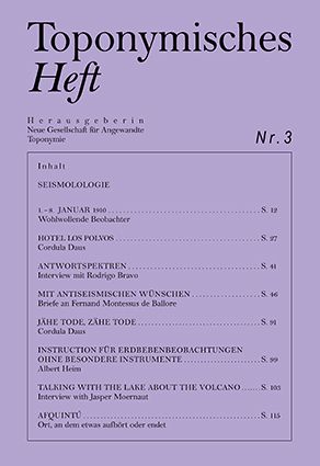 In ihrer aktuellen Publikation Toponymisches Heft Nr. 3 plädiert die Autorin für eine Erschütterungskunde, die sich ihrer eigenen Verletzlichkeit entsinnt. Neben praktischen Anleitungen, irdischen Evidenzen und Exkursen über eine unhaltbare Liebe stellt sie erstmals veröffentlichte Dokumente aus der Frühzeit der modernen Erdbebenforschung vor.